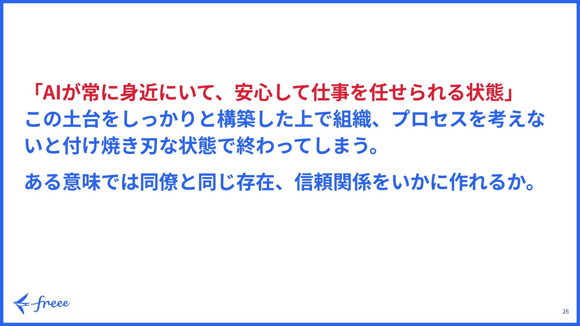 26 「AIが常に⾝近にいて、安⼼して仕事を任せられる状態」 この⼟台をしっかりと構築した上で組織、プロセスを考えな いと付け焼き刃な状態で終わってしまう。 ある意味では同僚と同じ存在、信頼関係をいかに作れるか。