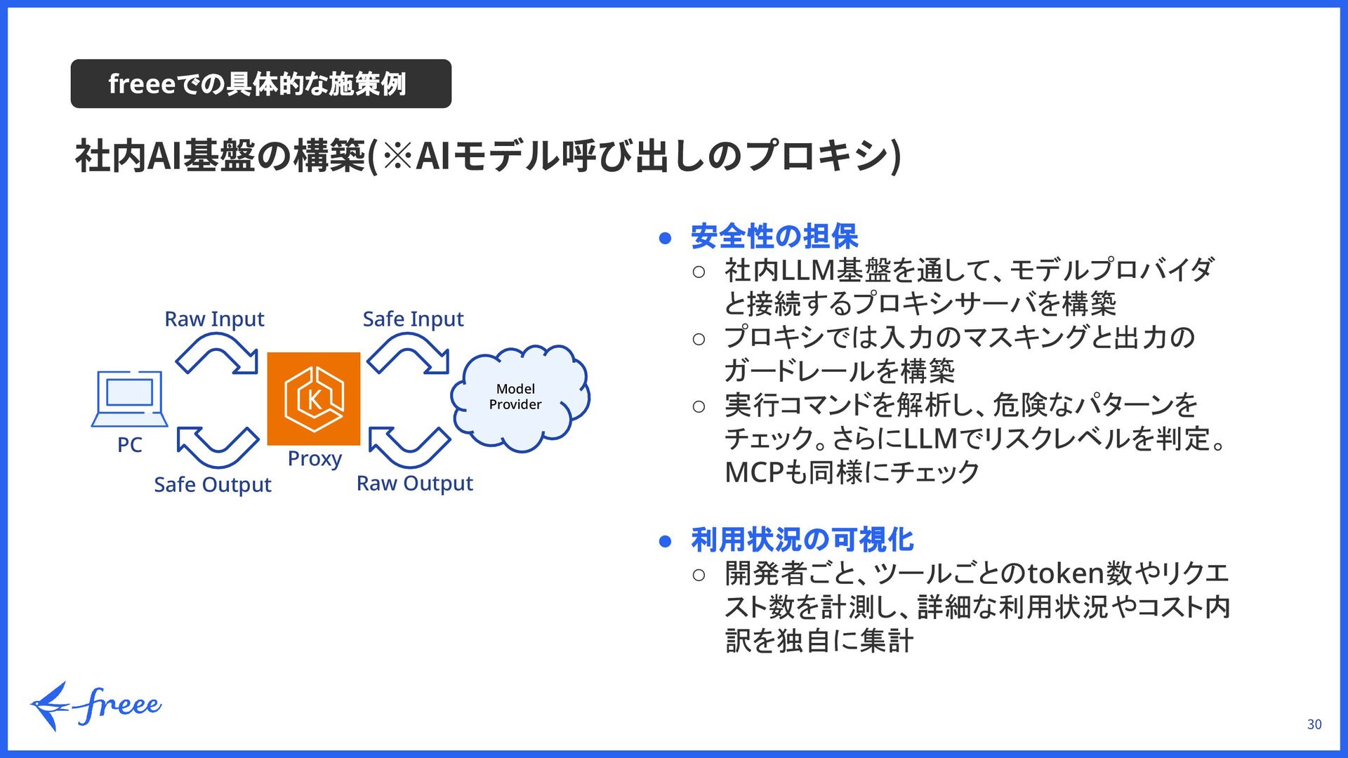 Safe Output Proxy PC Model Provider • 安全性の担保 ◦ 社内LLM基盤を通して、モデルプロバイダ と接続するプロキシサーバを構築 ◦ プロキシでは入力のマスキングと出力の ガードレールを構築 ◦ 実行コマンドを解析し、危険なパターンを チェック。さらにLLMでリスクレベルを判定。 MCPも同様にチェック • 利用状況の可視化 ◦ 開発者ごと、ツールごとのtoken数やリクエ スト数を計測し、詳細な利用状況やコスト内 訳を独自に集計