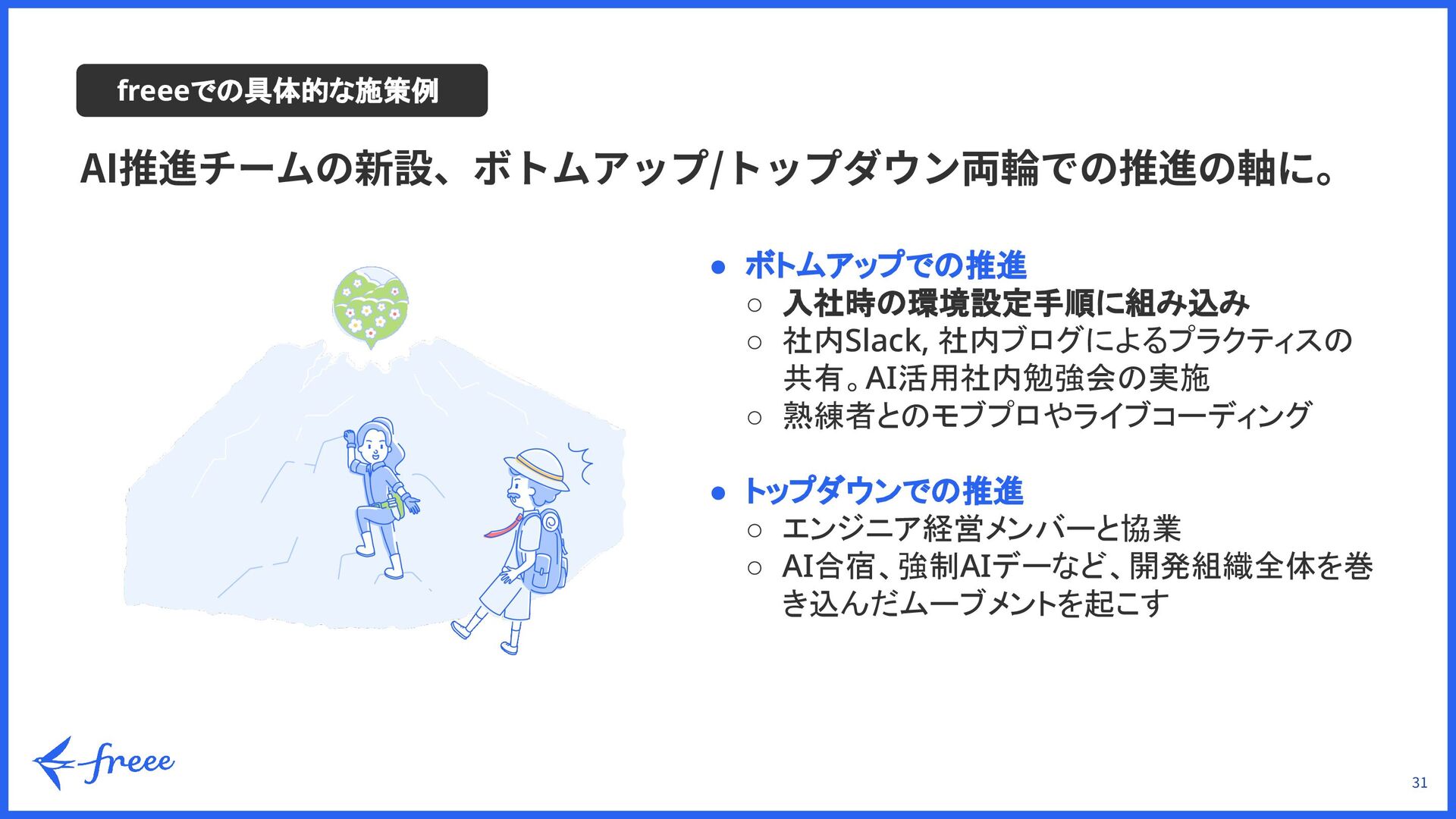 AI推進チームの新設 ◦ AI利⽤を推進する専⾨チームの組成、エンジニア経営メンバーと協業 • CTO直下のAI予算確保 ◦ ダイナミックな予算執⾏、⼗分なボリューム freeeでの具体的な施策例
