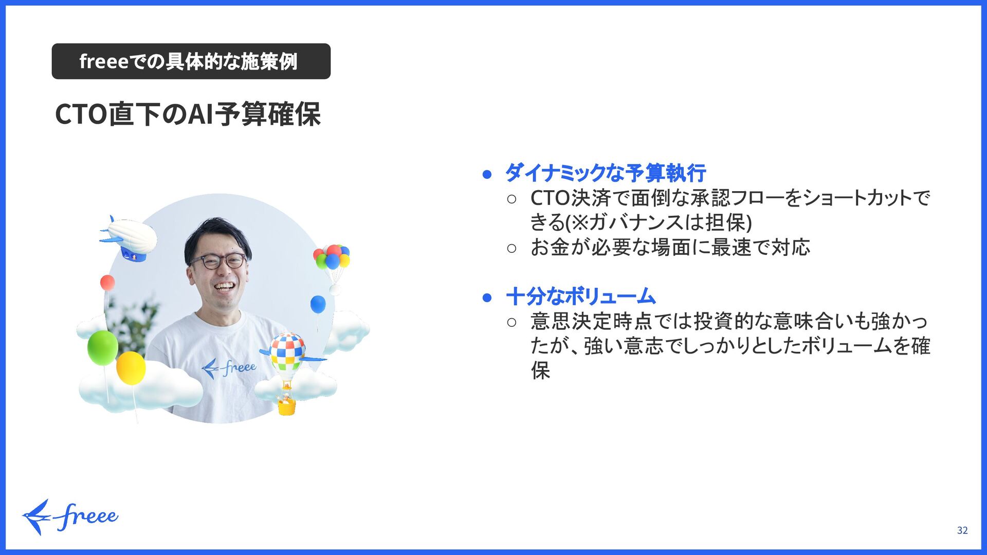 32 CTO直下のAI予算確保 • ダイナミックな予算執行 ◦ CTO決済で面倒な承認フローをショートカットで きる(※ガバナンスは担保) ◦ お金が必要な場面に最速で対応