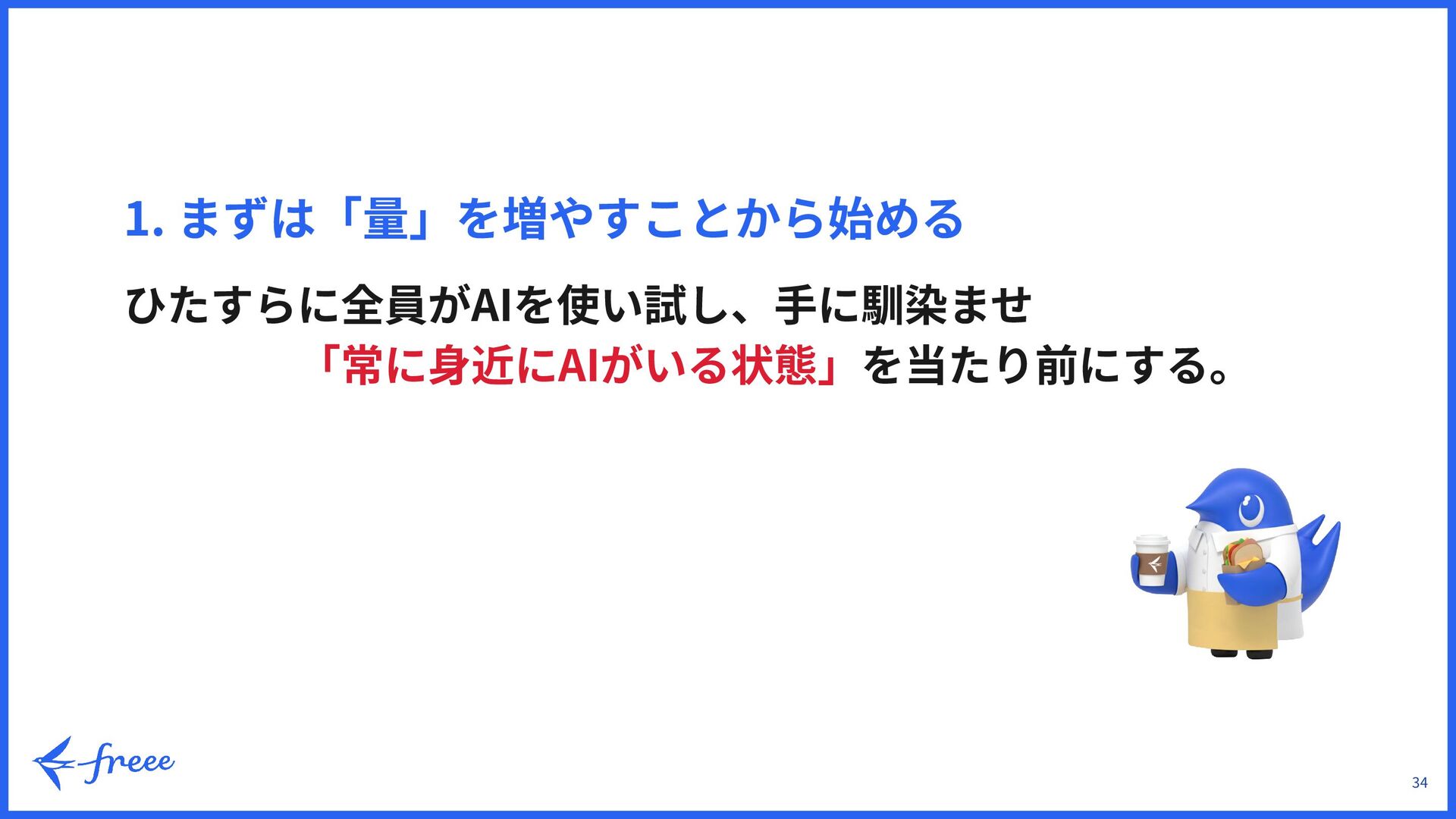 34 1. まずは「量」を増やすことから始める ひたすらに全員がAIを使い試し、⼿に馴染ませ 「常に⾝近にAIがいる状態」を当たり前にする。