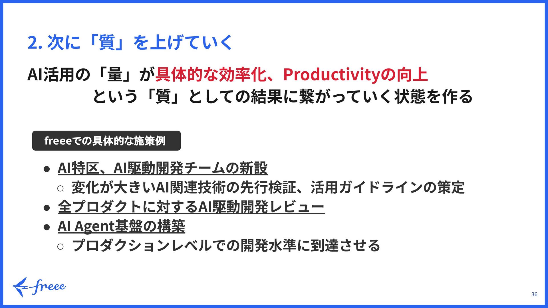 36 2. 次に「質」を上げていく AI活⽤の「量」が具体的な効率化、Productivityの向上 という「質」としての結果に繋がっていく状態を作る • AI特区、AI駆動開発チームの新設 ◦ 変化が⼤きいAI関連技術の先⾏検証、活⽤ガイドラインの策定 •