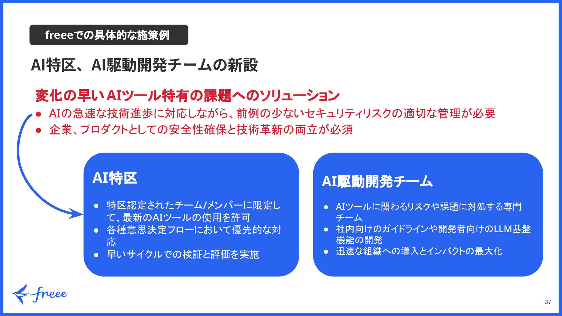 • 特区認定されたチーム/メンバーに限定し て、最新のAIツールの使用を許可 • 各種意思決定フローにおいて優先的な対 応 • 早いサイクルでの検証と評価を実施 AI駆動開発チーム • AIツールに関わるリスクや課題に対処する専門 チーム • 社内向けのガイドラインや開発者向けのLLM基盤 機能の開発 • 迅速な組織への導入とインパクトの最大化 freeeでの具体的な施策例