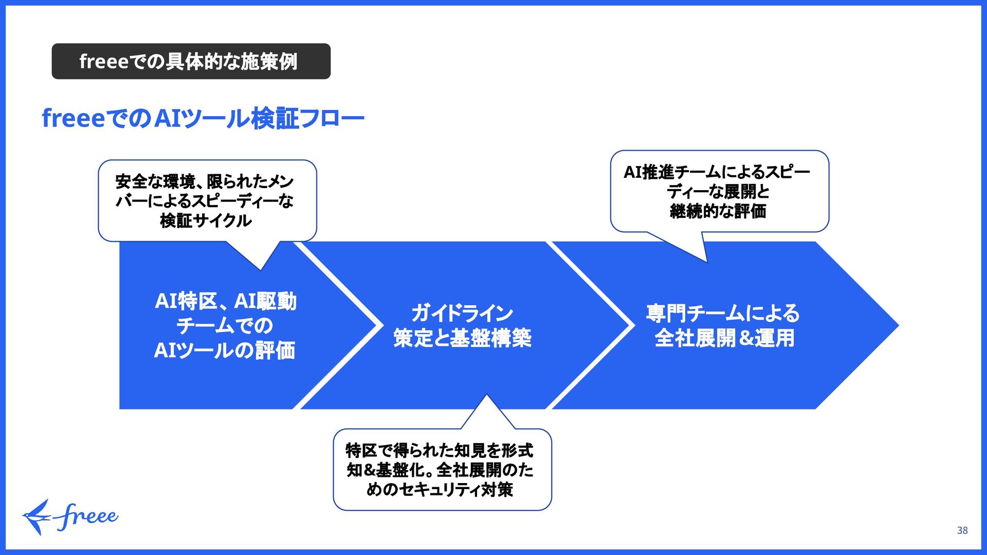 37 AI特区、AI駆動開発チームの新設 変化の早い AIツール特有の課題へのソリューション • AIの急速な技術進歩に対応しながら、前例の少ないセキュリティリスクの適切な管理が必要 • 企業、プロダクトとしての安全性確保と技術革新の両立が必須 AI特区