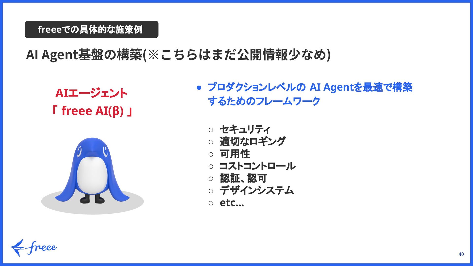 ◦ セキュリティ ◦ 適切なロギング ◦ 可用性 ◦ コストコントロール ◦ 認証、認可 ◦ デザインシステム ◦ etc… AIエージェント 「 freee AI(β) 」 freeeでの具体的な施策例
