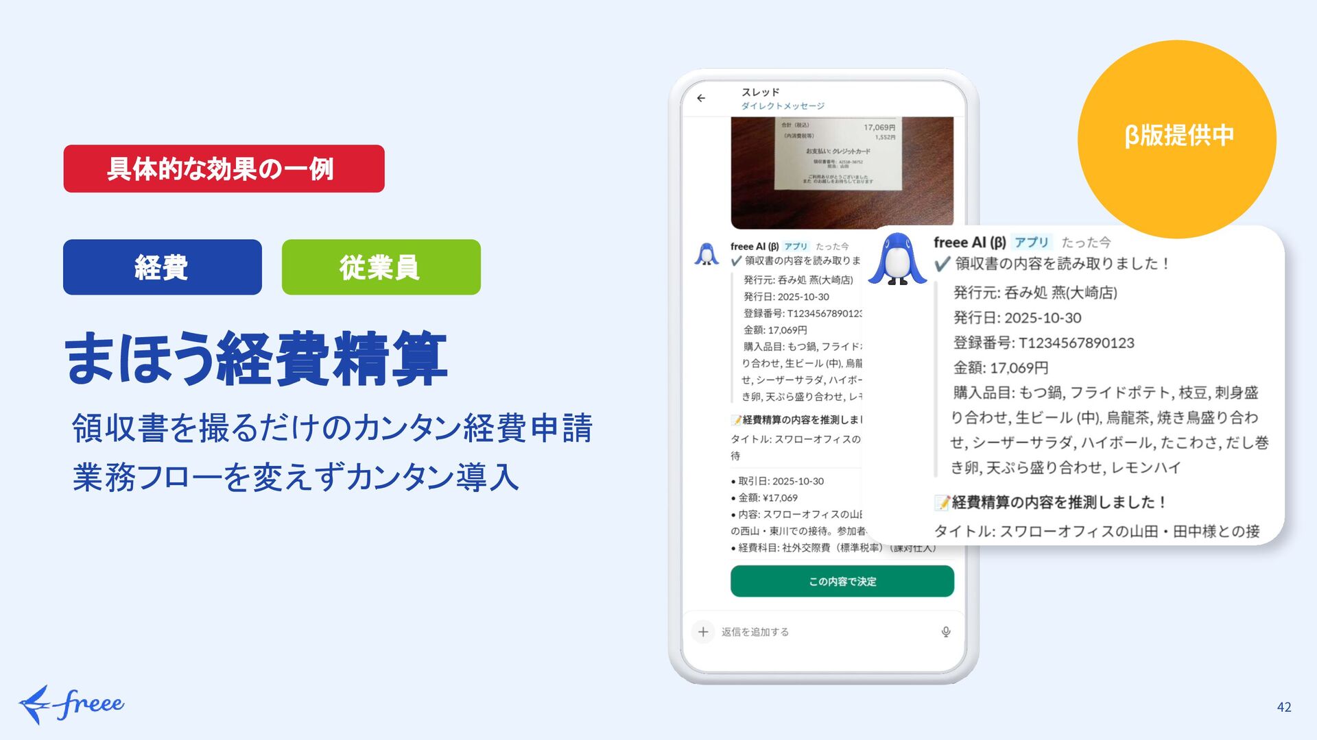 42 まほう経費精算 経費 従業員 領収書を撮るだけのカンタン経費申請 業務フローを変えずカンタン導入 β版提供中 具体的な効果の一例