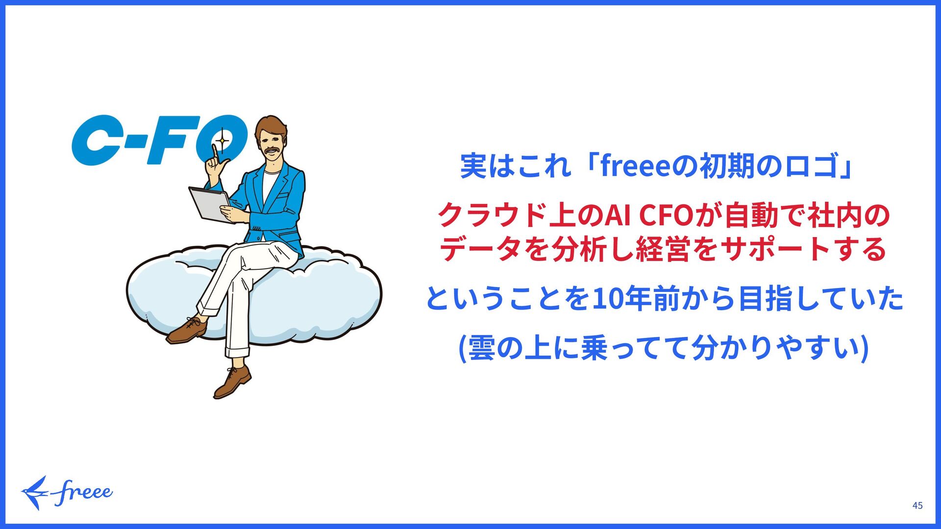 45 実はこれ「freeeの初期のロゴ」 クラウド上のAI CFOが⾃動で社内の データを分析し経営をサポートする ということを10年前から⽬指していた (雲の上に乗ってて分かりやすい)
