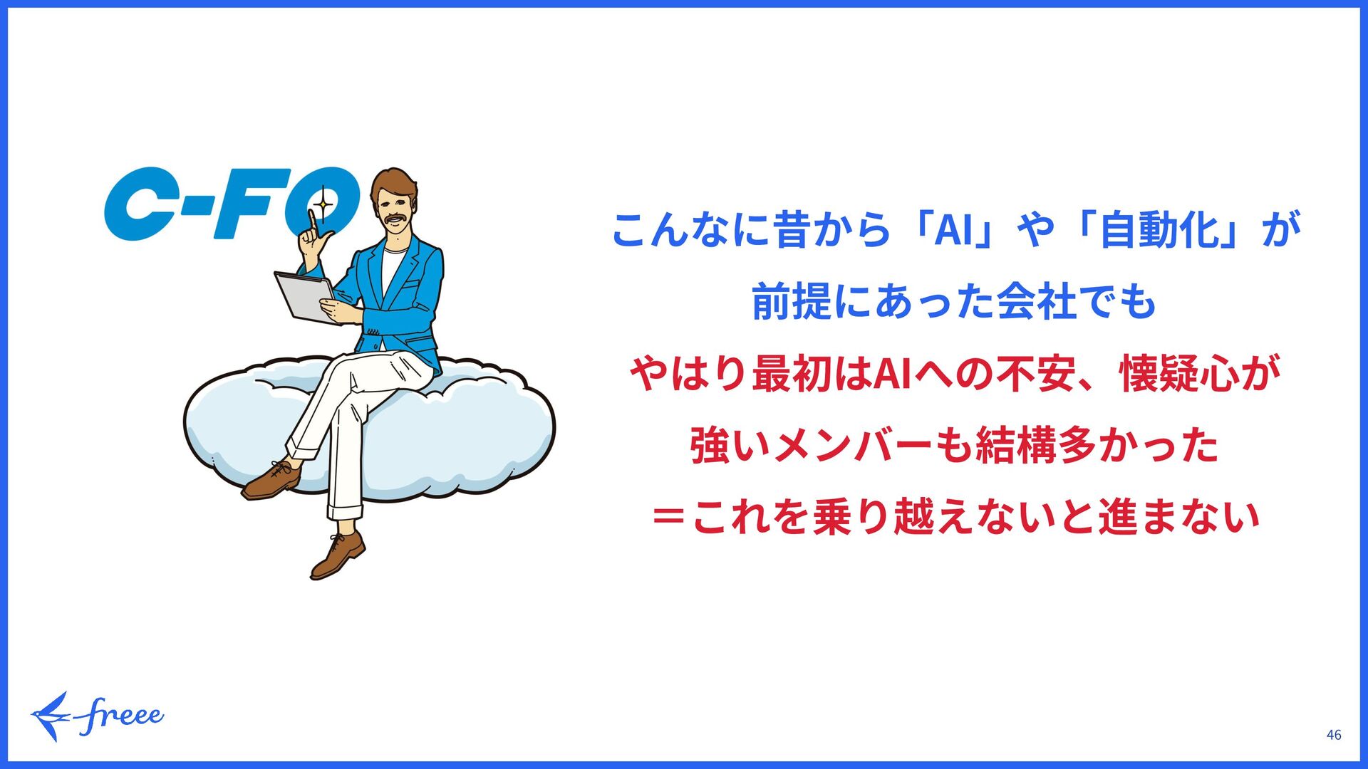 46 こんなに昔から「AI」や「⾃動化」が 前提にあった会社でも やはり最初はAIへの不安、懐疑⼼が 強いメンバーも結構多かった =これを乗り越えないと進まない