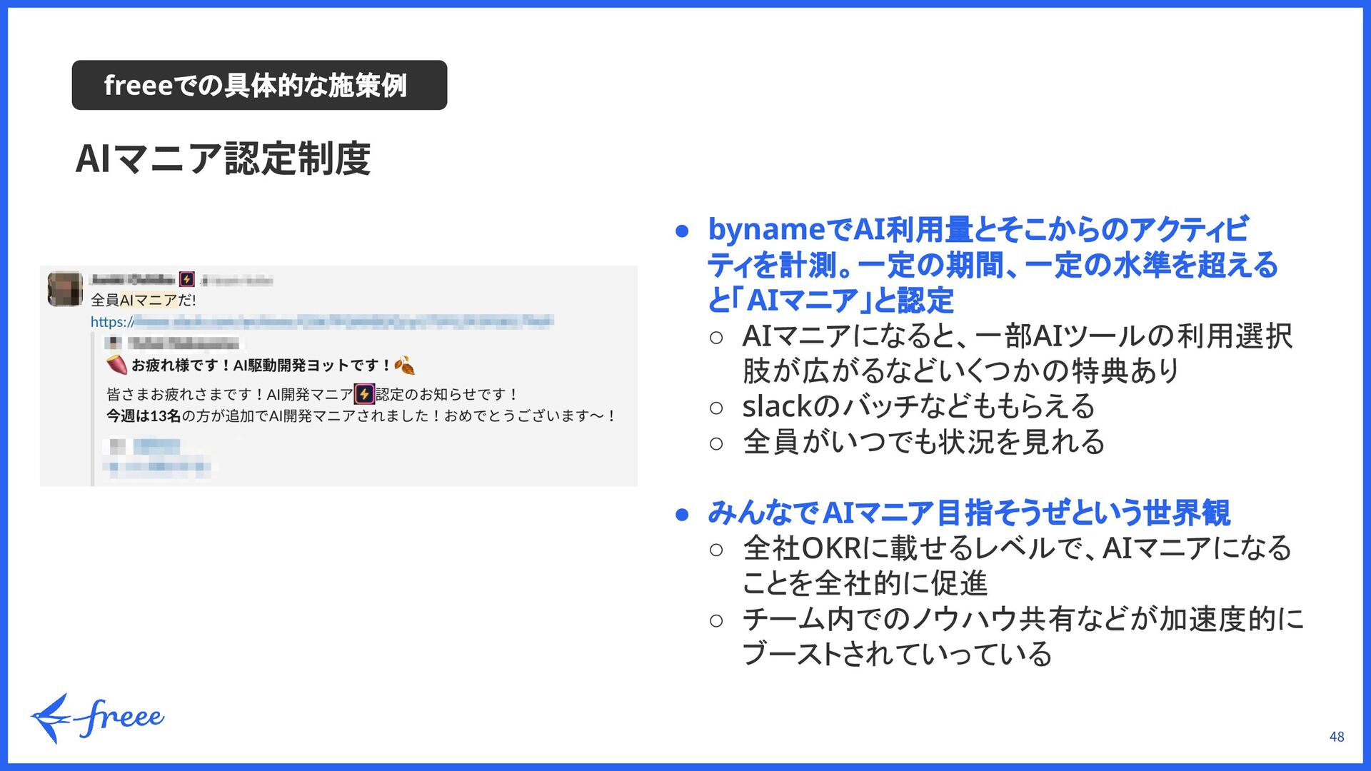 48 AIマニア認定制度 freeeでの具体的な施策例 • bynameでAI利用量とそこからのアクティビ ティを計測。一定の期間、一定の水準を超える と「AIマニア」と認定 ◦