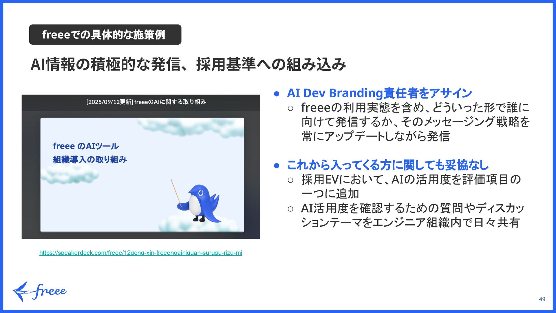 AI情報の積極的な発信、採⽤基準への組み込み ◦ 今回のように内部情報を積極的に公開 ◦ この中⾝を⾒て「⼊りたい」と思う⼈を引き寄せる freeeでの具体的な施策例