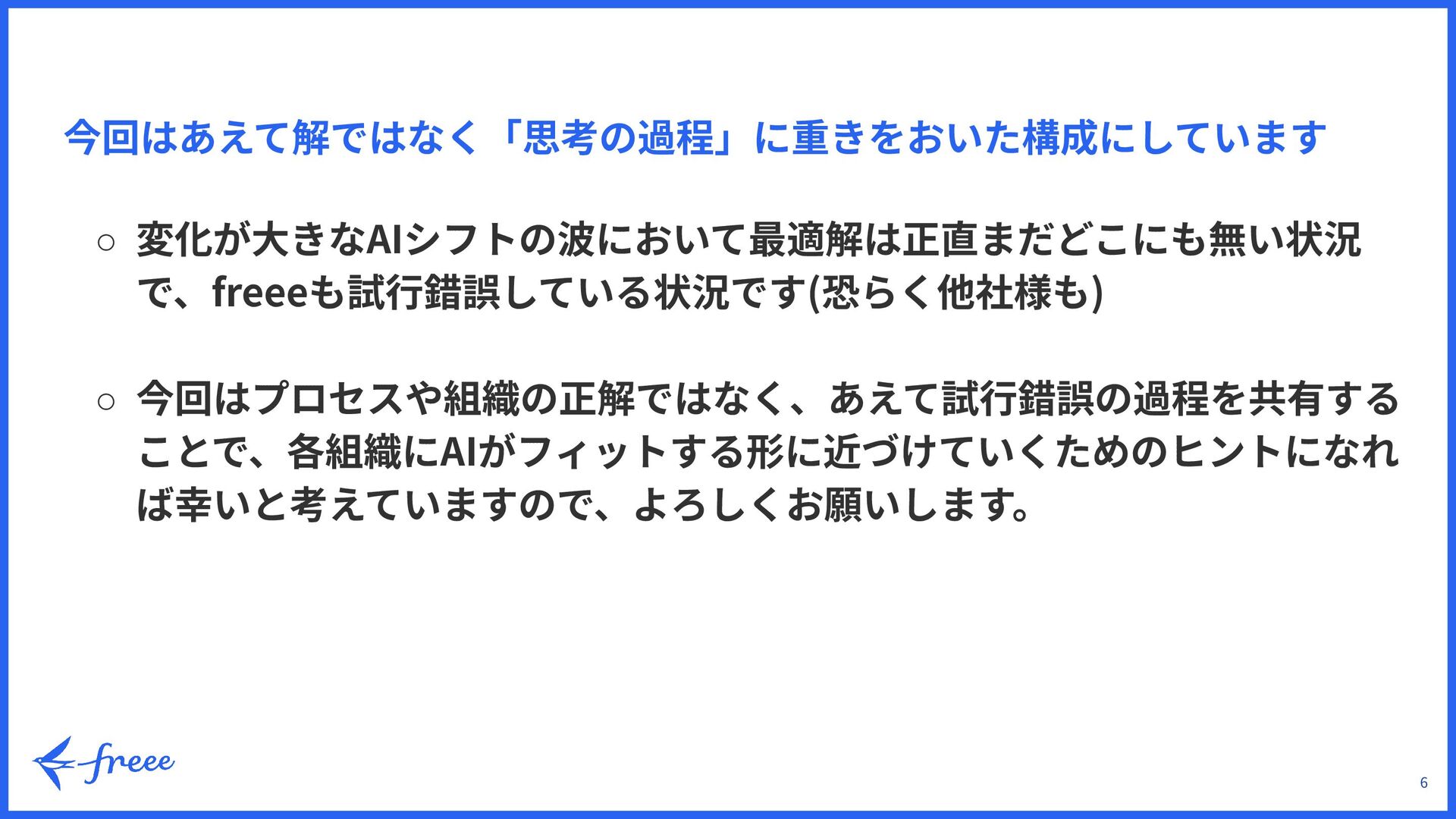 6 今回はあえて解ではなく「思考の過程」に重きをおいた構成にしています ◦ 変化が⼤きなAIシフトの波において最適解は正直まだどこにも無い状況 で、freeeも試⾏錯誤している状況です(恐らく他社様も) ◦ 今回はプロセスや組織の正解ではなく、あえて試⾏錯誤の過程を共有する ことで、各組織にAIがフィットする形に近づけていくためのヒントになれ ば幸いと考えていますので、よろしくお願いします。