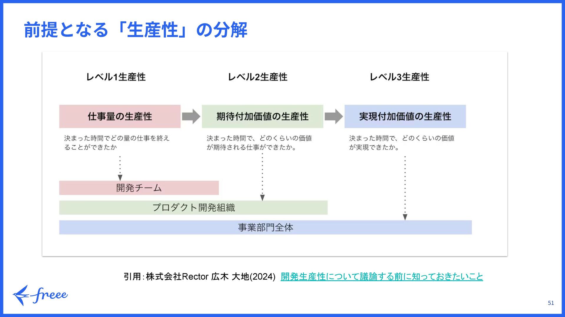 51 前提となる「⽣産性」の分解 引用:株式会社Rector 広木 大地(2024) 開発生産性について議論する前に知っておきたいこと