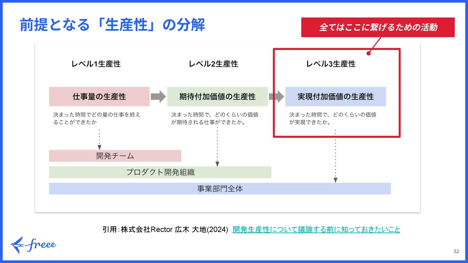 52 前提となる「⽣産性」の分解 引用:株式会社Rector 広木 大地(2024) 開発生産性について議論する前に知っておきたいこと 全てはここに繋げるための活動