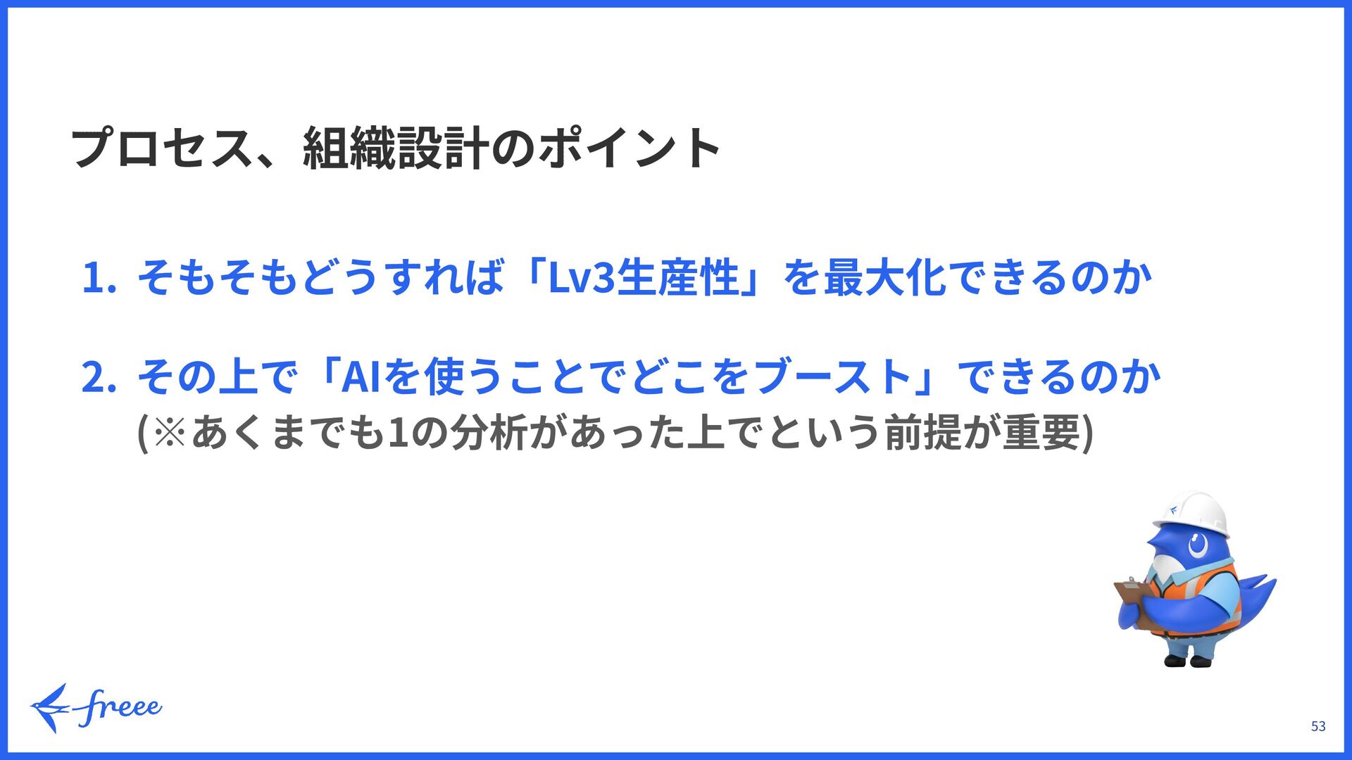 53 1. そもそもどうすれば「Lv3⽣産性」を最⼤化できるのか 2. その上で「AIを使うことでどこをブースト」できるのか (※あくまでも1の分析があった上でという前提が重要) プロセス、組織設計のポイント