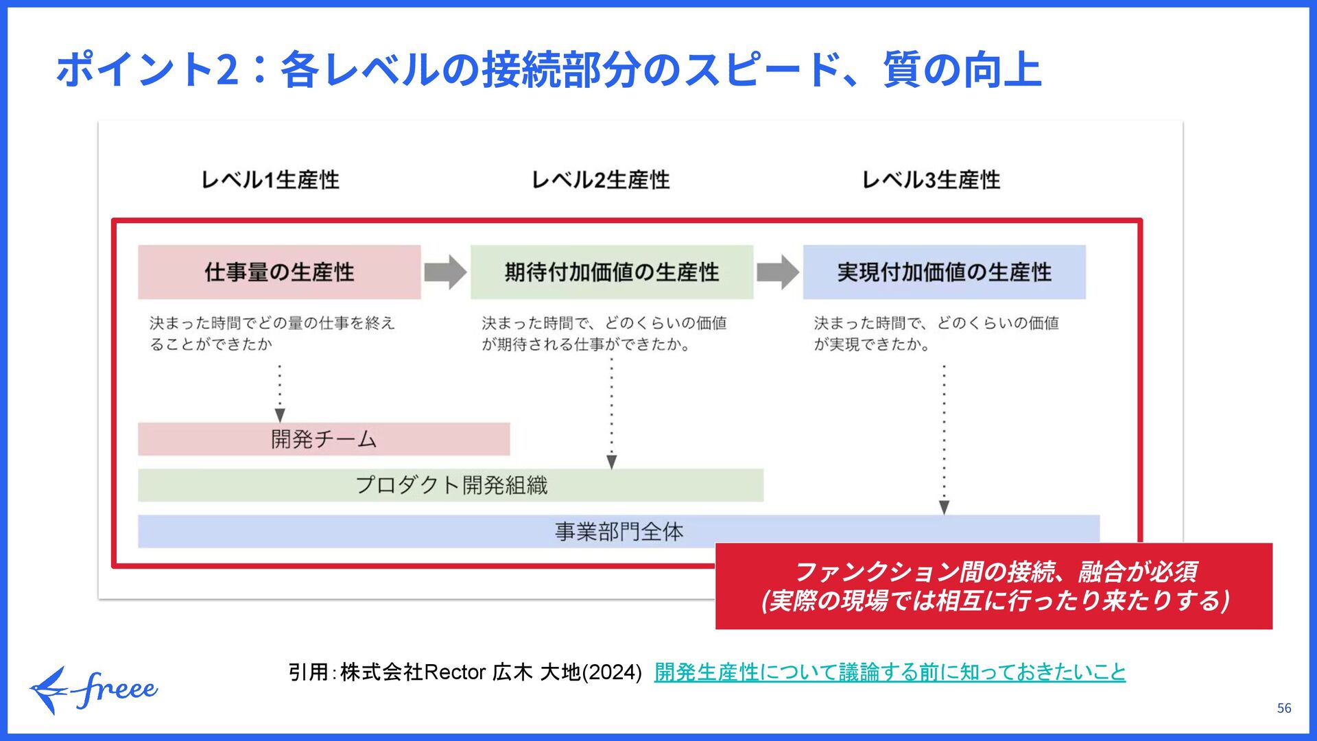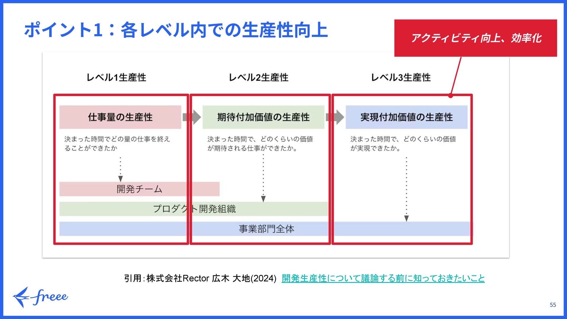 55 ポイント1:各レベル内での⽣産性向上 引用:株式会社Rector 広木 大地(2024) 開発生産性について議論する前に知っておきたいこと アクティビティ向上、効率化