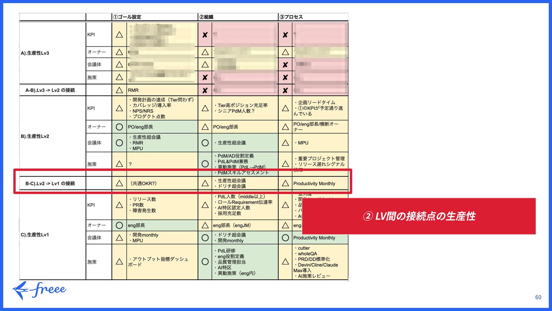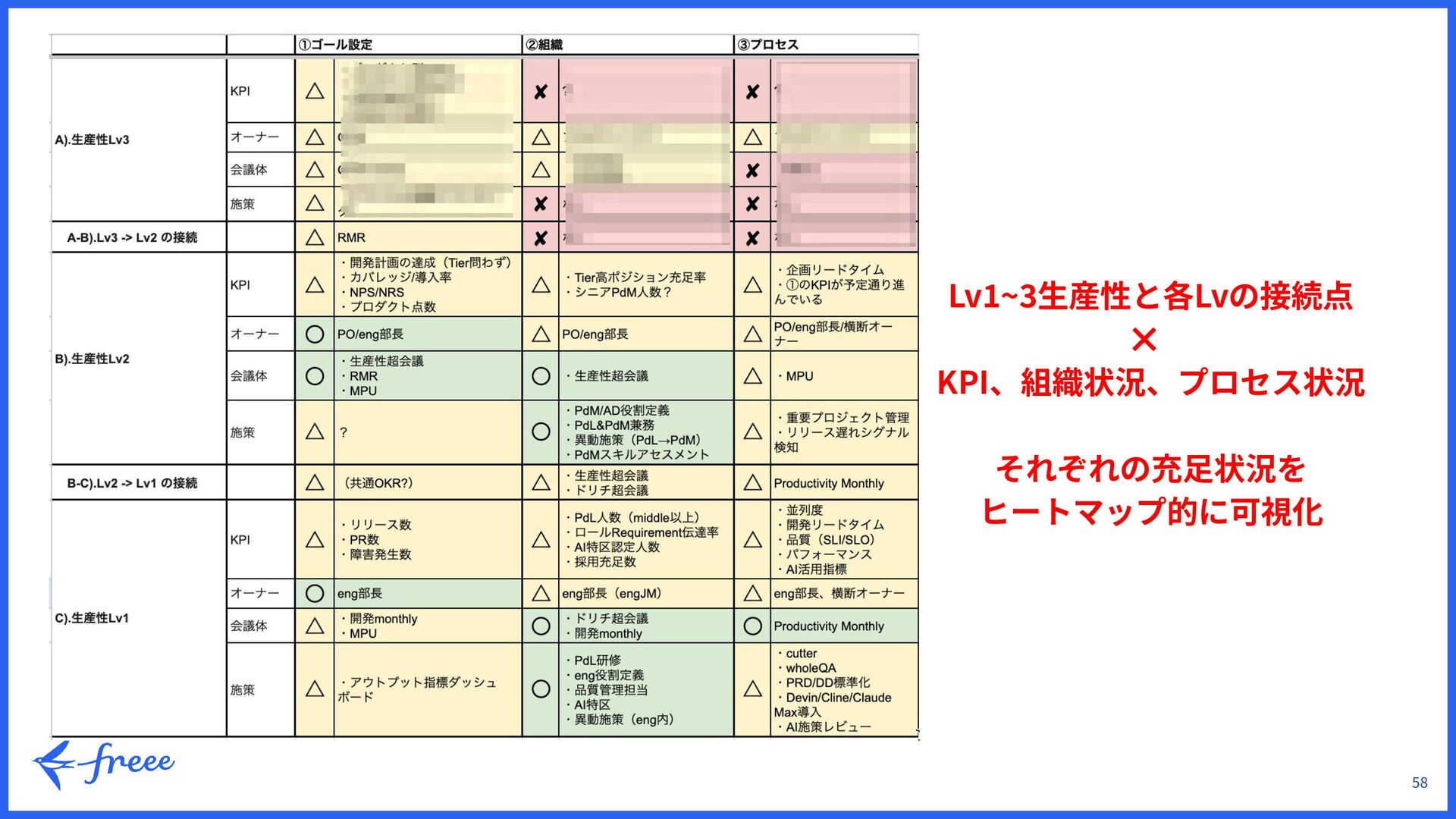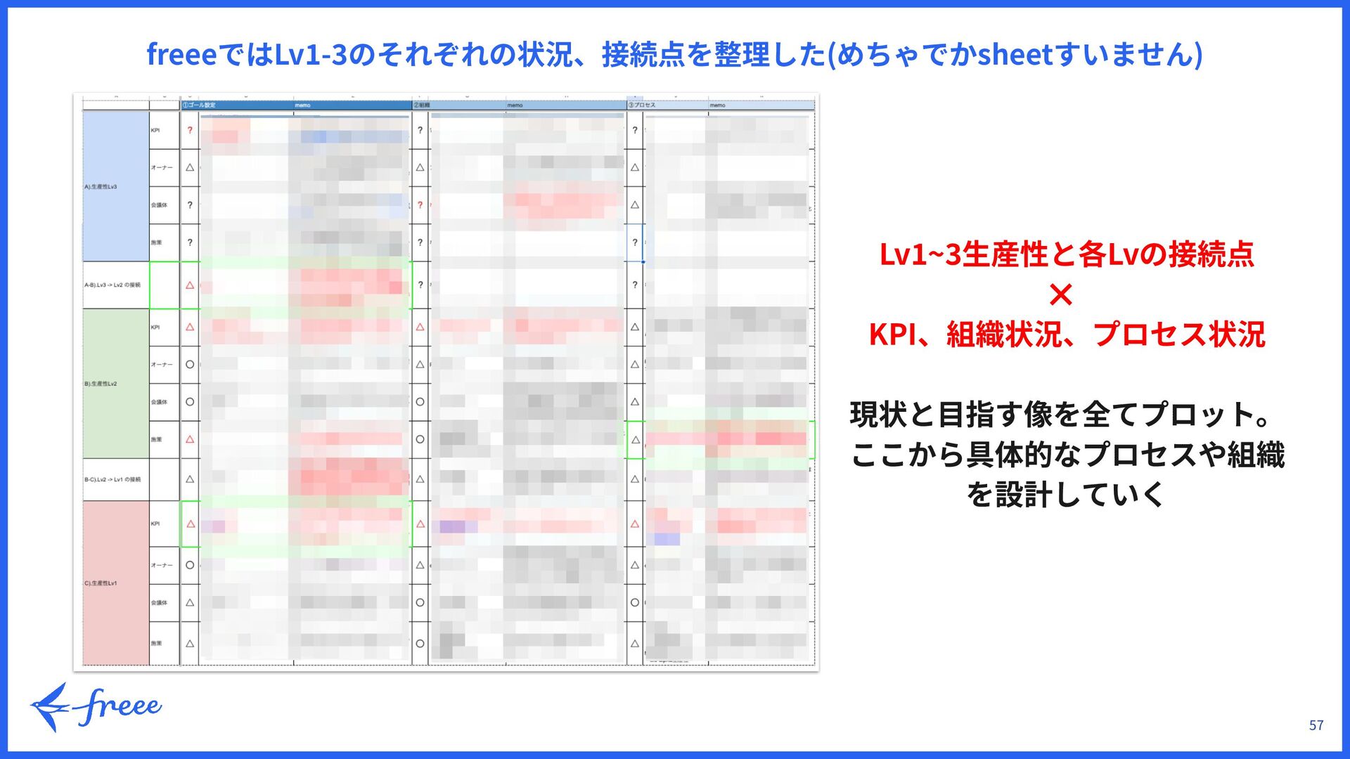 57 freeeではLv1-3のそれぞれの状況、接続点を整理した(めちゃでかsheetすいません) Lv1~3⽣産性と各Lvの接続点 ✕ KPI、組織状況、プロセス状況 現状と⽬指す像を全てプロット。 ここから具体的なプロセスや組織 を設計していく