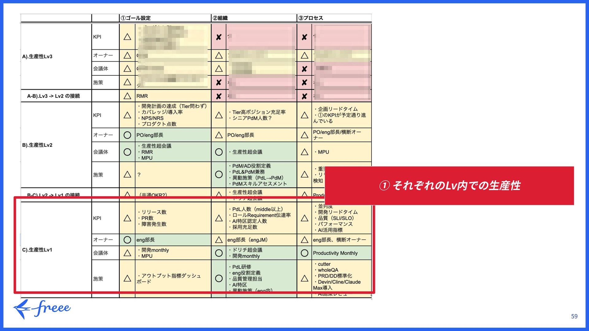 58 Lv1~3⽣産性と各Lvの接続点 ✕ KPI、組織状況、プロセス状況 それぞれの充⾜状況を ヒートマップ的に可視化