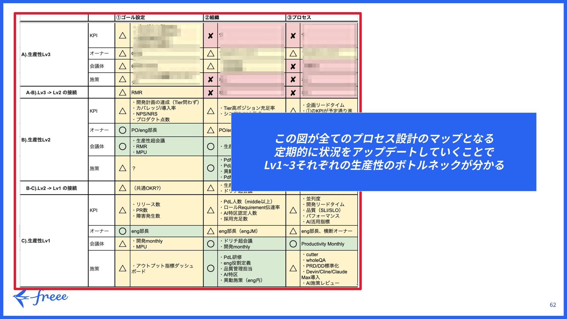 62 この図が全てのプロセス設計のマップとなる 定期的に状況をアップデートしていくことで Lv1~3それぞれの⽣産性のボトルネックが分かる
