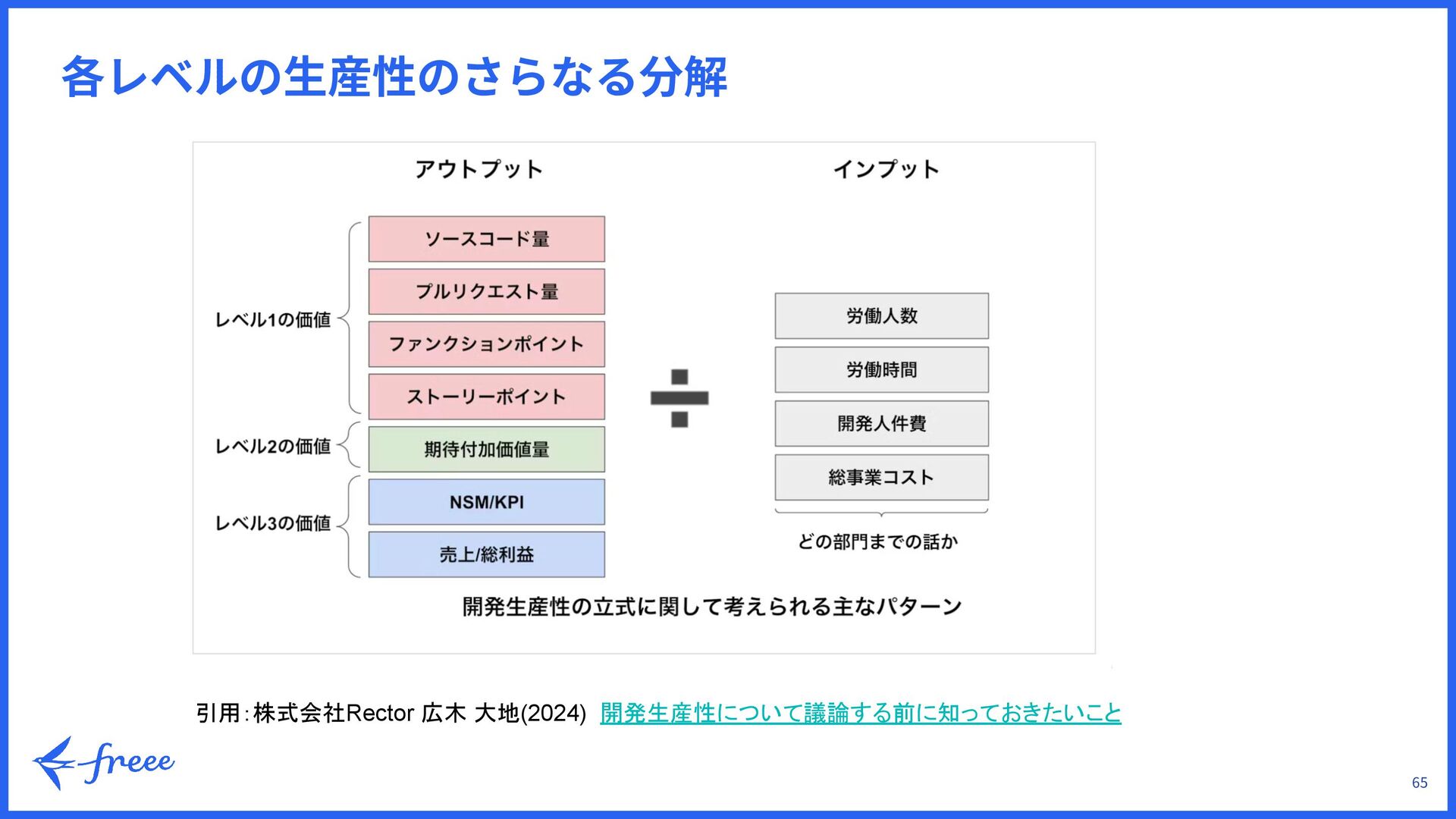 65 各レベルの⽣産性のさらなる分解 引用:株式会社Rector 広木 大地(2024) 開発生産性について議論する前に知っておきたいこと