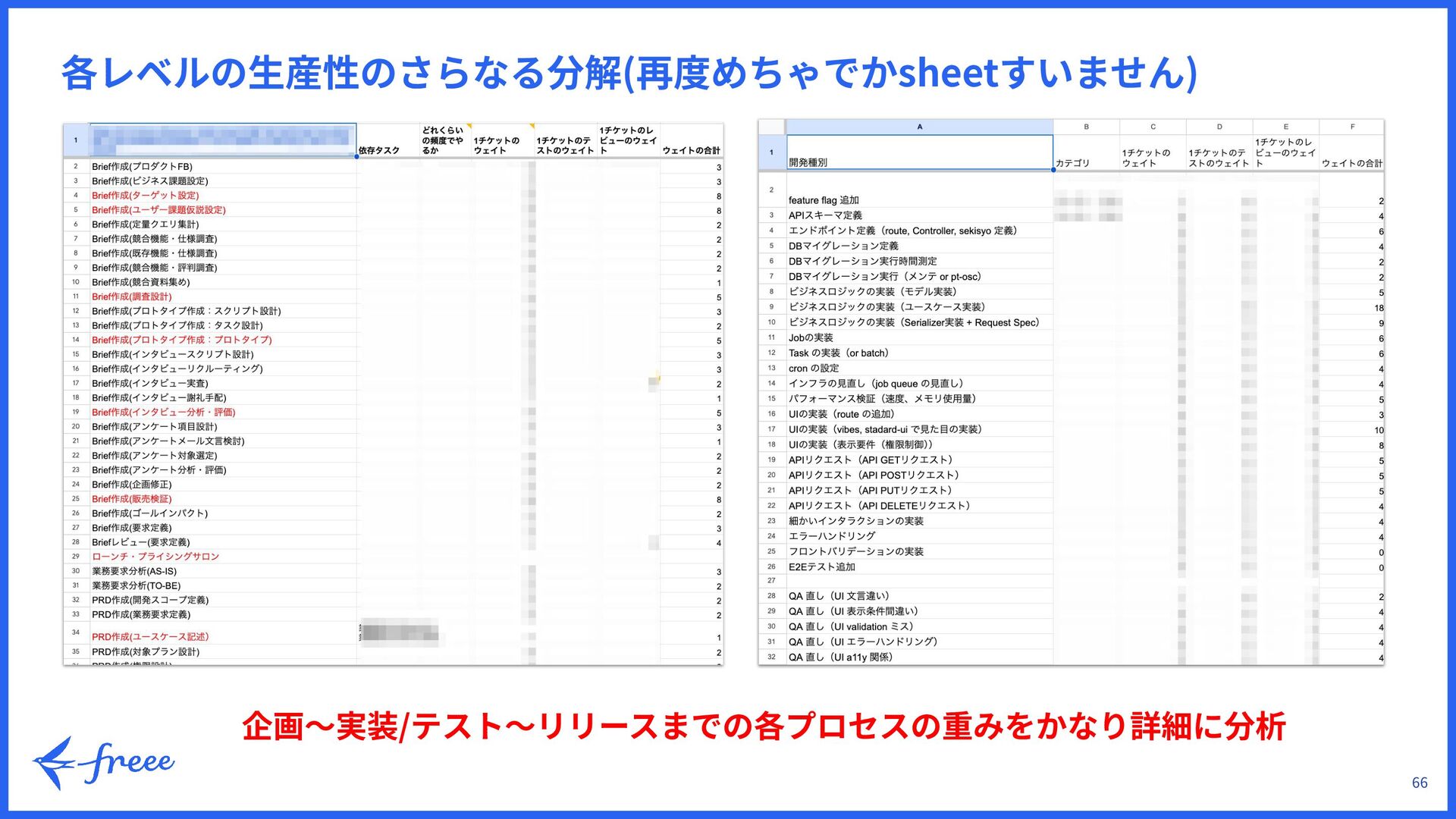 66 各レベルの⽣産性のさらなる分解(再度めちゃでかsheetすいません) 企画〜実装/テスト〜リリースまでの各プロセスの重みをかなり詳細に分析