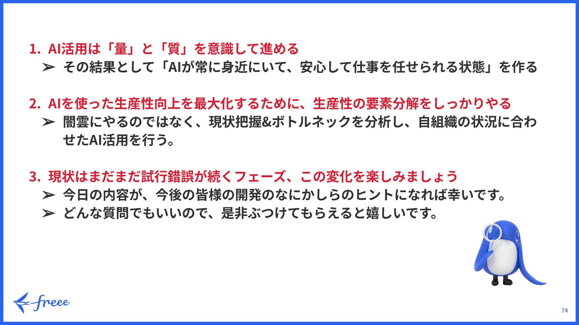 72 1. 「Lv1⽣産性」はめちゃくちゃ上げられる ➢ 企画〜実装〜テスト問わずアクティビティ増⼤の効果は⾮常に⼤きい 2. 「Lv2⽣産性」も⼀定の効果が出る ➢ 特に企画段階において何を作るかの仮説⽴案に⼤きな効果あり 3.