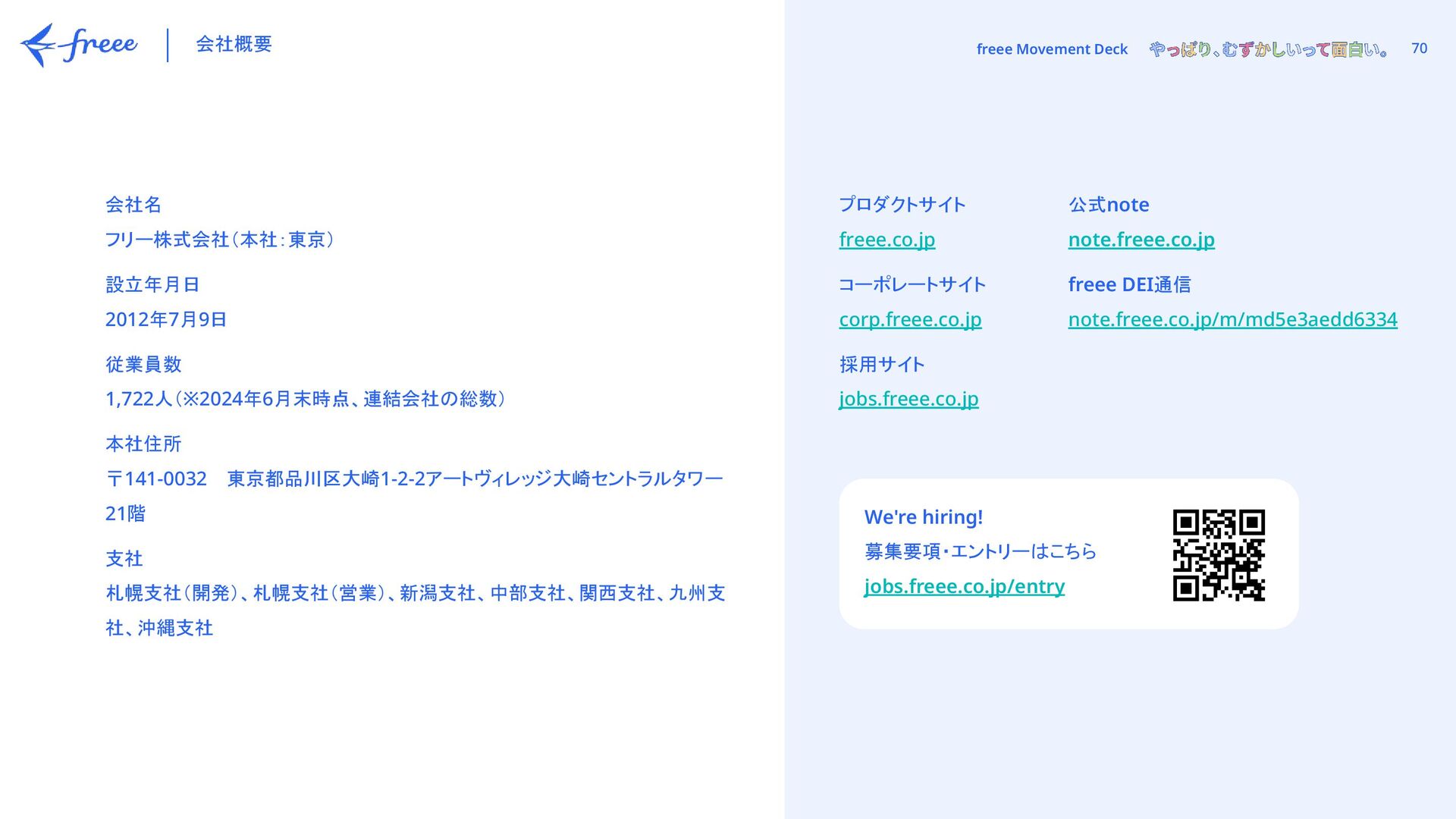 1,722人(※2024年6月末時点、連結会社の総数) 本社住所 〒141-0032 東京都品川区大崎1-2-2アートヴィレッジ大崎セントラルタワー 21階 支社 札幌支社(開発)、札幌支社(営業)、新潟支社、中部支社、関西支社、九州支 社、沖縄支社 プロダクトサイト freee.co.jp コーポレートサイト corp.freee.co.jp 採用サイト jobs.freee.co.jp 公式note note.freee.co.jp freee DEI通信 note.freee.co.jp/m/md5e3aedd6334 We're hiring! 募集要項・エントリーはこちら jobs.freee.co.jp/entry
