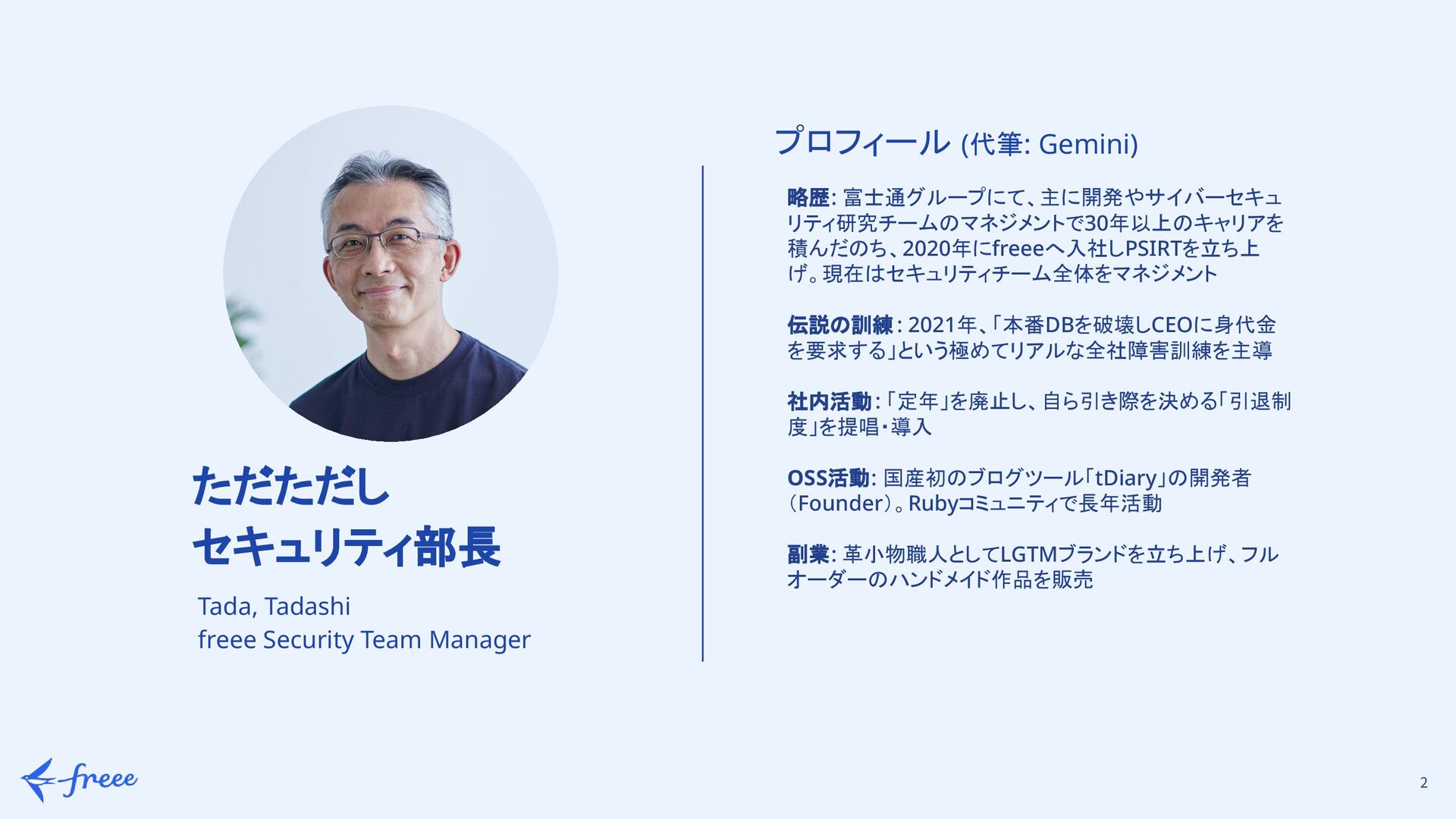 略歴: 富士通グループにて、主に開発やサイバーセキュ リティ研究チームのマネジメントで30年以上のキャリアを 積んだのち、2020年にfreeeへ入社しPSIRTを立ち上 げ。現在はセキュリティチーム全体をマネジメント
