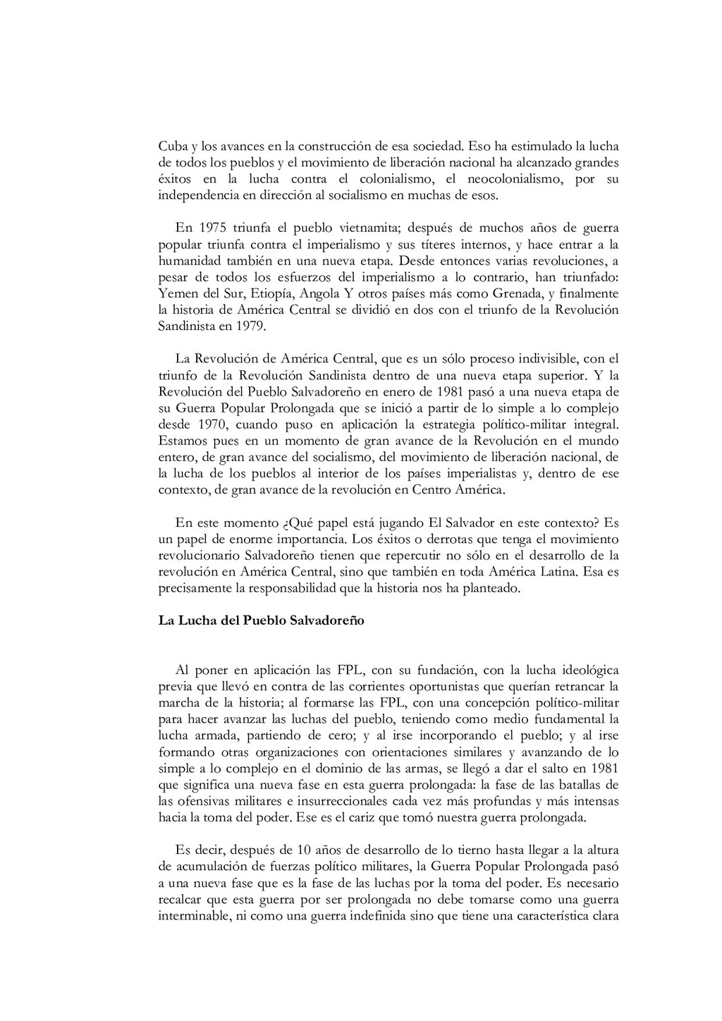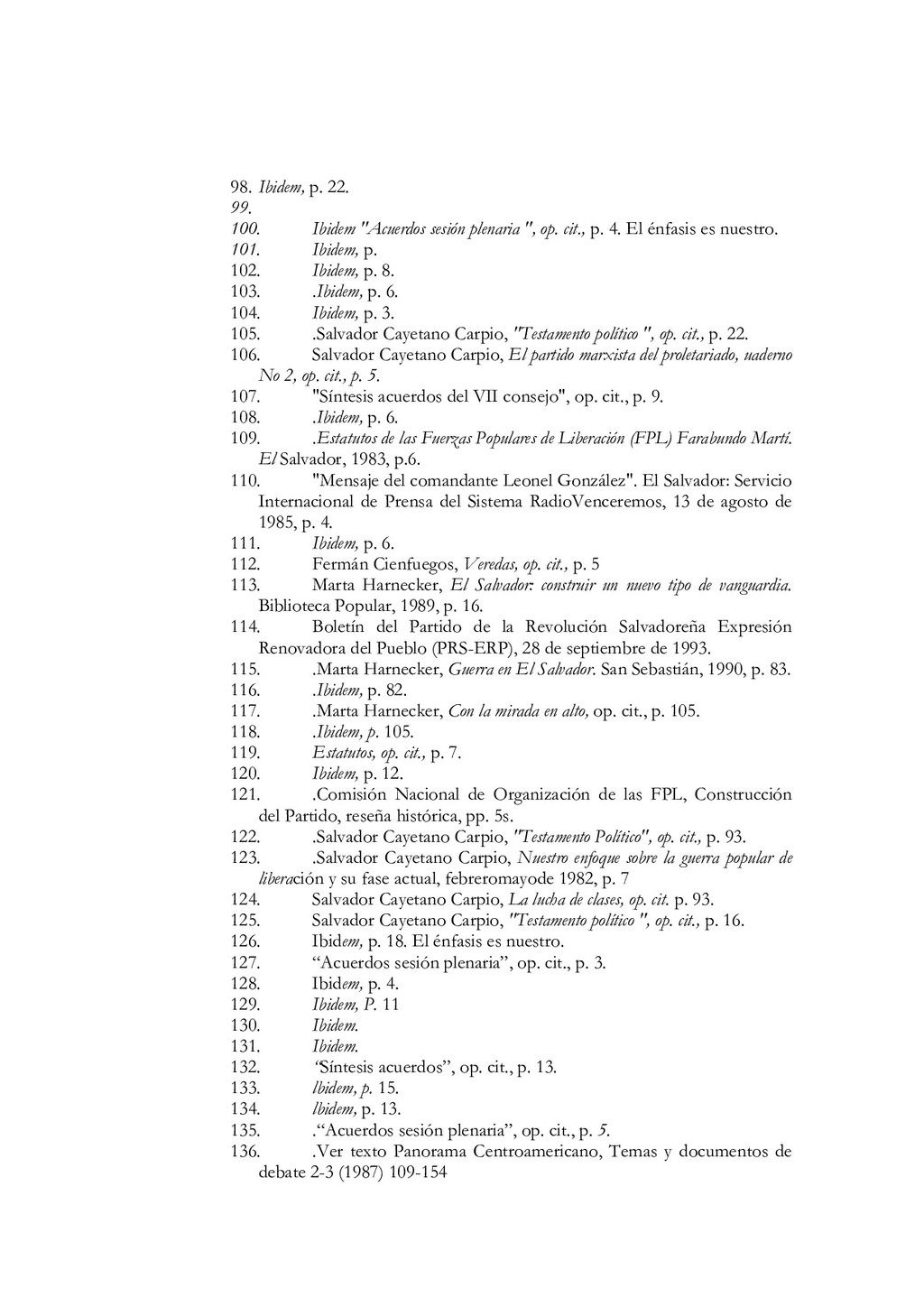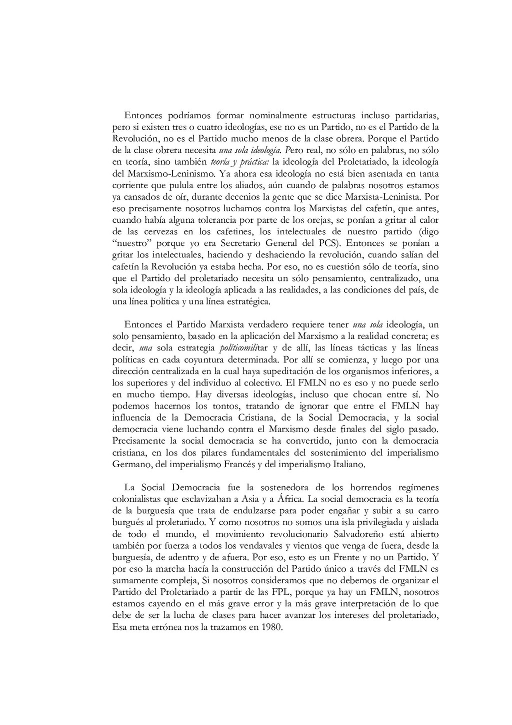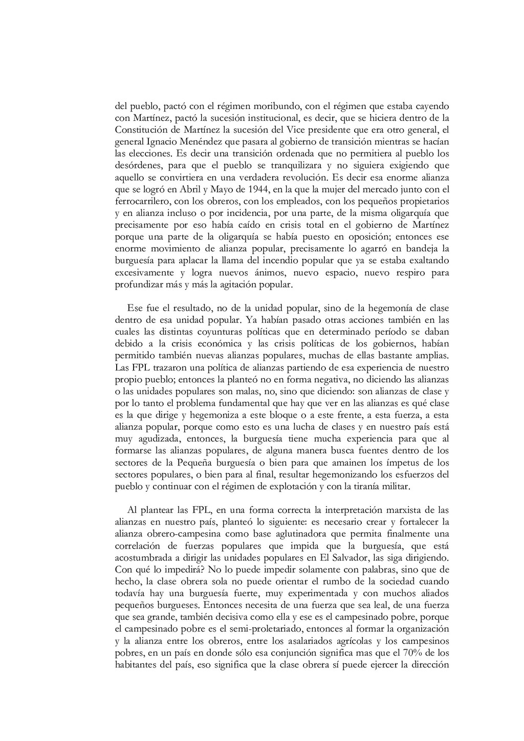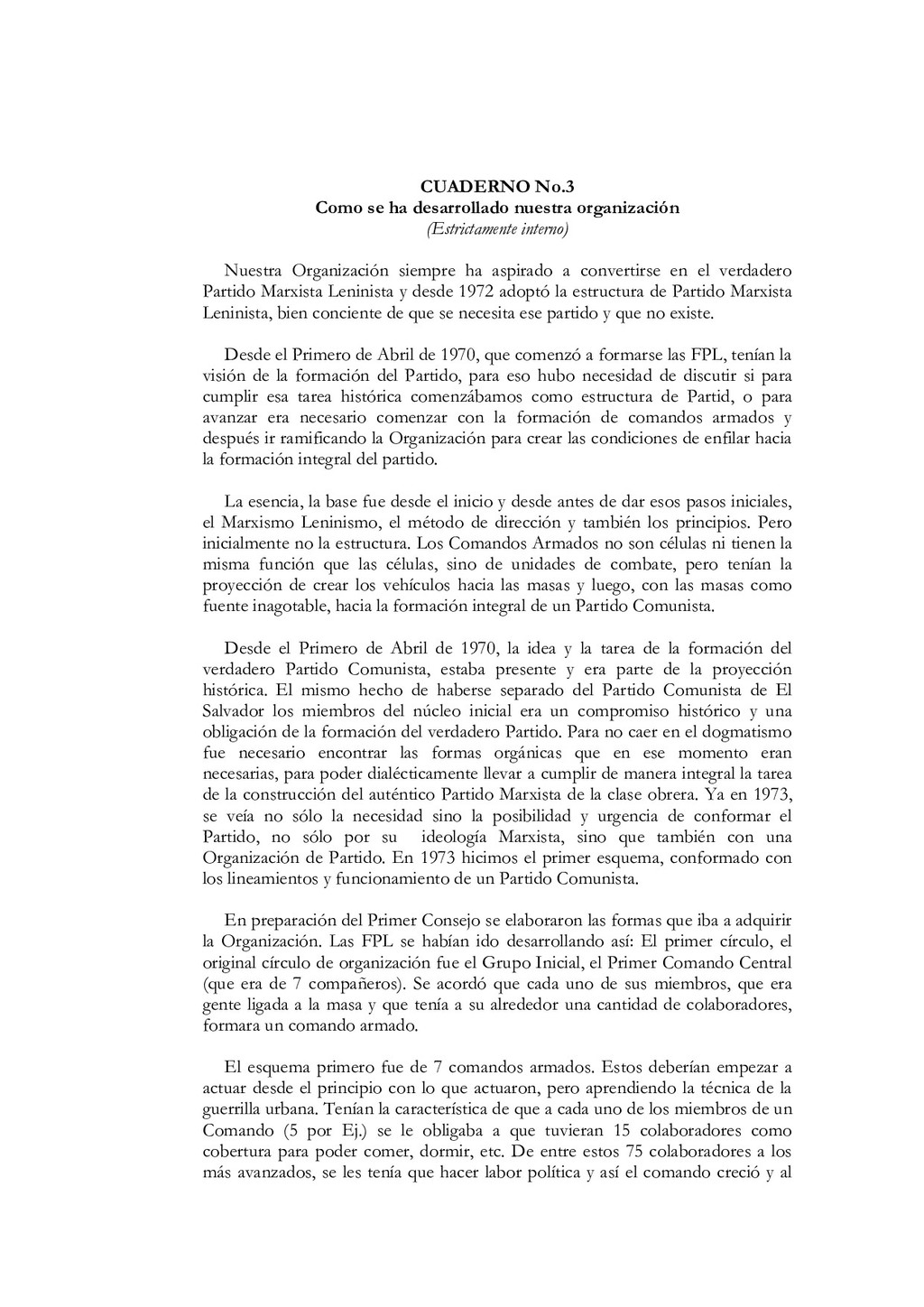 N'5, El partido debe estar íntimamente ligado al pueblo, a las masas. Colección Educación Revolucionaria, junio de 1982, p. 1. 68. Ibidem, pp. 5s. 69. Mayores detalles en Salvador Cayetano Carpio, La lucha de clases, op. cit., pp. 11-40. 70. Salvador Cayetano Carpio, El partido marxista leninista del proletariado, Cuaderno N' 5, op. cit., pp. 6s.El énfasis es nuestro. 71. lbidem, p. 8. 72. Salvador Cayetano Carpio, "Testamento político ", op. cit., p. 9. 73. Ibidem, p. 20 74. Salvador Cayetano Carpio, El partido marxista leninista del proletariado, Cuaderno N'6, Sobre elcentralismo democrático. Colección Educación Revolucionaria, junio de 1982, p. 12. 75. Bases estatuarias de las FPL, enero de 1979, p. 12. El énfasis es nuestro. 76. Salvador Cayetano Carpio, El partido marxista leninista del proletariado, Cuaderno N' 6, op. cit., pp. 13s. 77. Ibidem, pp. 13s. 78. Mario Lungo, El Salvador 1981-1984, la dimensión política de la guerra. San Salvador: UCA Editores, 1985, p. 19. 79. Salvador Cayetano Carpio, El partido marxista leninista del proletariado, Cuaderno No 1, op.cit., p. 25 80. "Informe general de la comisión política", op.cit., septiembre de 1981, pp.9-12 81. "Informe general", op. cit. p. 13 82. "Informe general", op. cit. p. 13 83. Salvador Cayetano Carpio, El partido marxista leninista del proletariado, Cuaderno No 4, Introducción y algo más sobre la necesidad de que las FPL Farabundo Martí se transformen en el verdadero partido marxista leninista del proletariado salvadoreño. Colección Educación Revolucionaria, octubre de 1982, pp. 17-20. El énfasis es nuestro. 84. "El primer consejo revolucionario", op. cit., p. 17. El énfasis es nuestro. 85. Bases estatuarias de las FPL, enero de 1979, p. 9. El énfasis es nuestro. 86. El texto de la declaración en Rafael Menjívar, El Salvador.- el eslabón, op. cit.,p. 195. 87. Mario Menéndez Rodríguez, El Salvador.- una auténtica guerra civil. San José: EDUCA, 1981, pp. 41s. 88. Ibidem, p. 185. El énfasis es nuestro 89. Rafael Menjívar, El Salvador: el eslabón, op. cit., p. 201. El énfasis es nuestro. 90. Ibidem, p. 202. El énfasis es nuestro. 91. Fermán Cienfuegos, Veredas de la audacia, historia del FMLN. Ediciones Roque Dalton, 1986, p. 41. 92. "Informe general", op. cit., p. 41. 93. Ibidem, p. 42. 94. Ibidem, pp. 45s. 95. Ibidem, p. 47. El énfasis es nuestro. 96. Ibidem, p. 49. 97. Salvador Cayetano Carpio, "Testamento político", op. cit., p. 20.