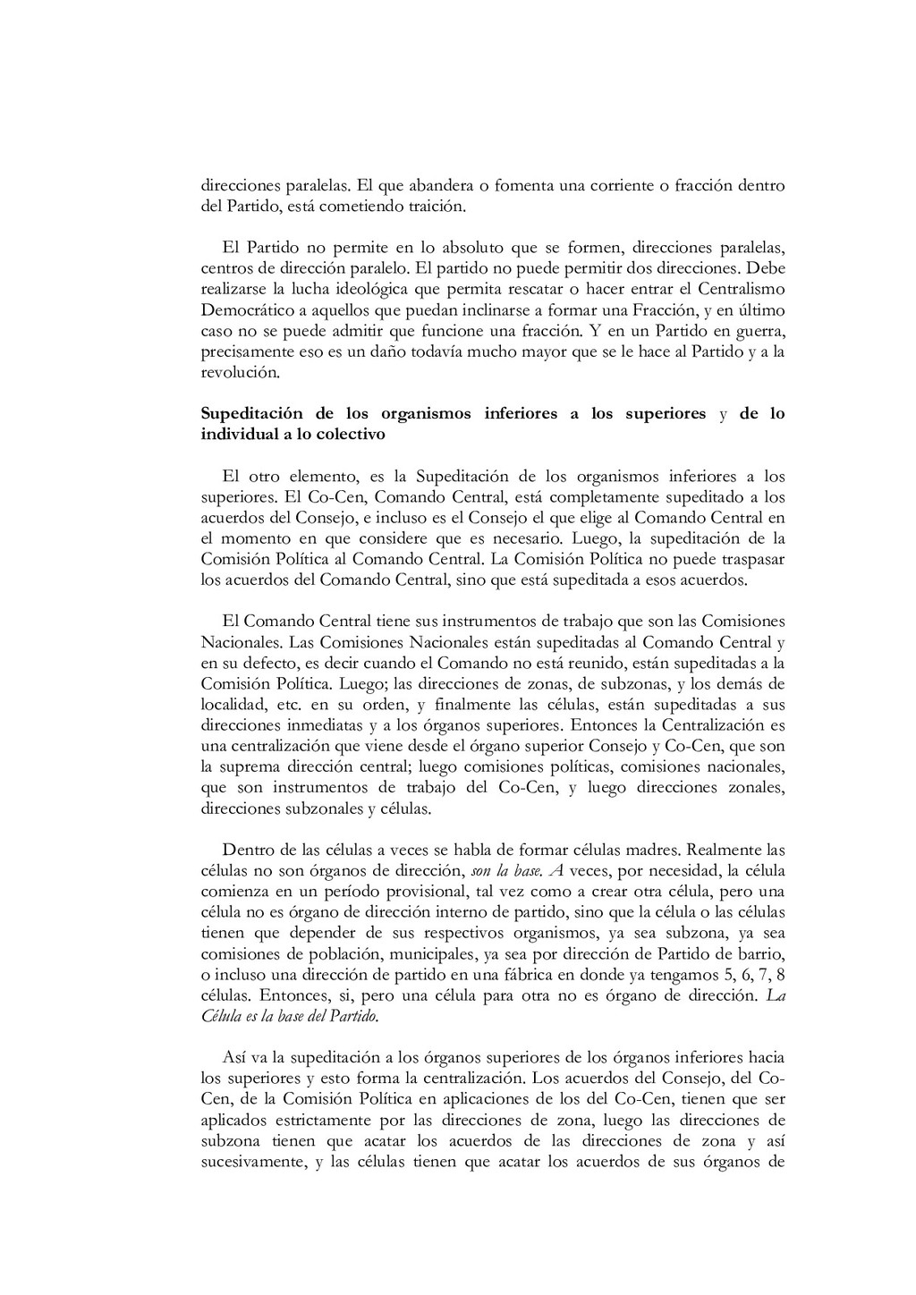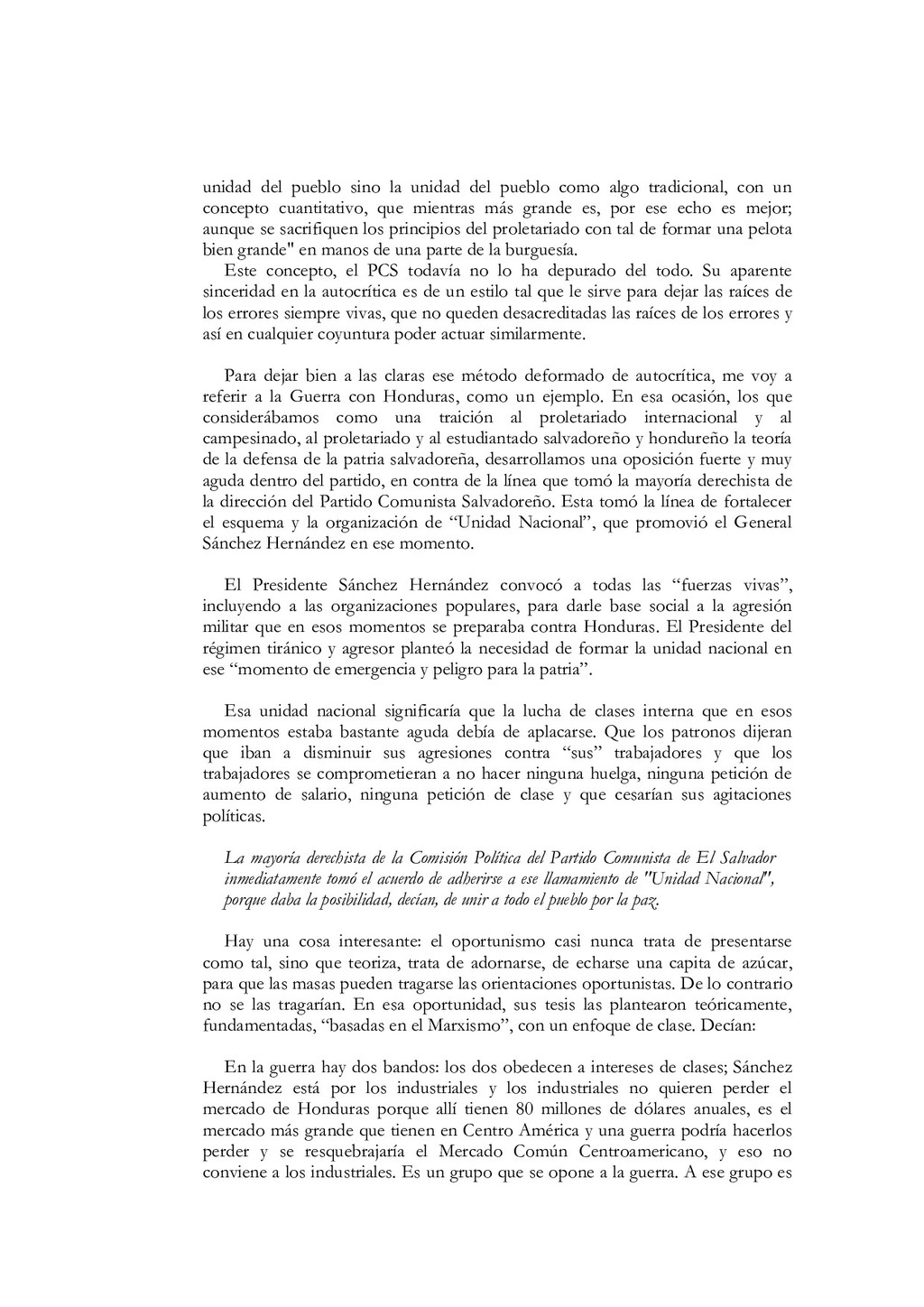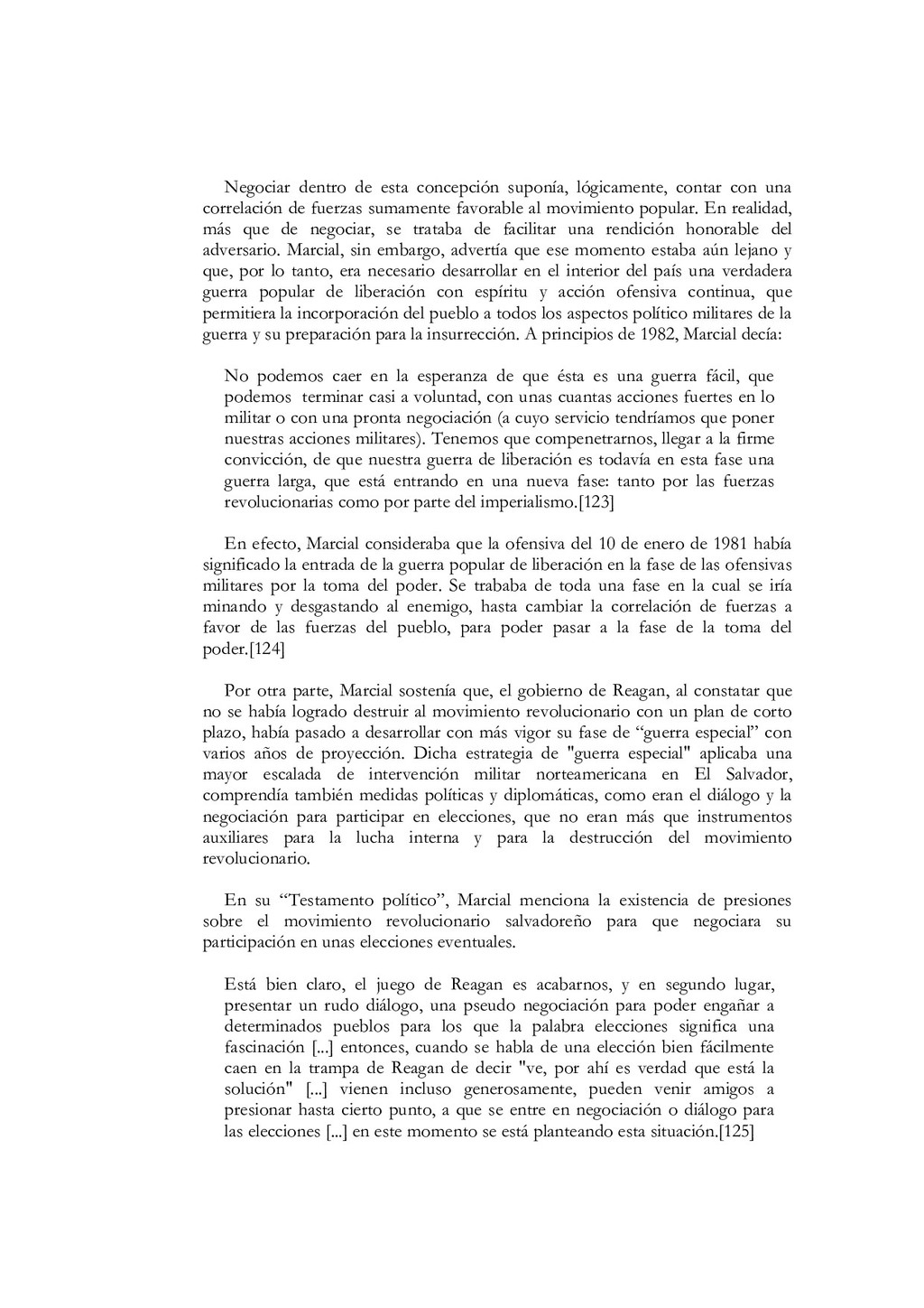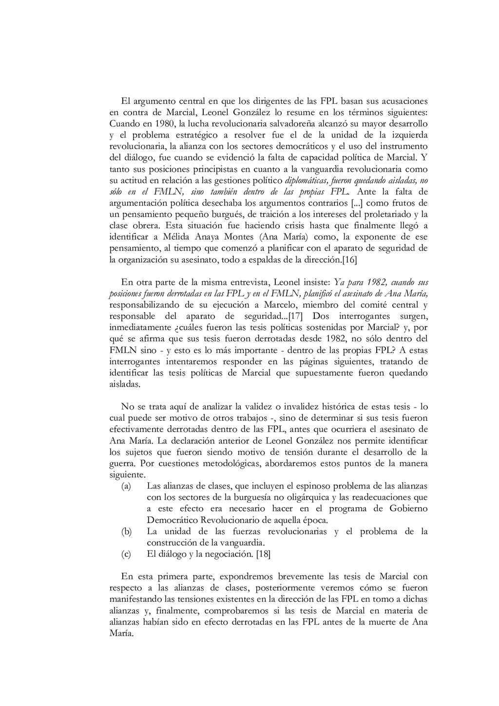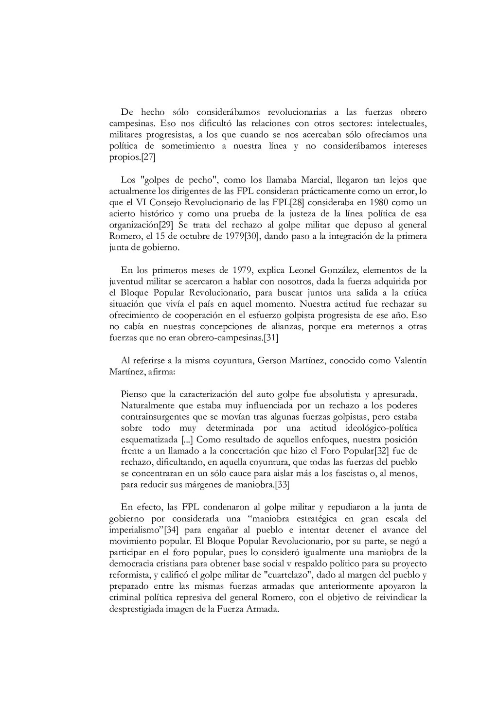 N'5, El partido debe estar íntimamente ligado al pueblo, a las masas. Colección Educación Revolucionaria, junio de 1982, p. 1. 68. Ibidem, pp. 5s. 69. Mayores detalles en Salvador Cayetano Carpio, La lucha de clases, op. cit., pp. 11-40. 70. Salvador Cayetano Carpio, El partido marxista leninista del proletariado, Cuaderno N' 5, op. cit., pp. 6s.El énfasis es nuestro. 71. lbidem, p. 8. 72. Salvador Cayetano Carpio, "Testamento político ", op. cit., p. 9. 73. Ibidem, p. 20 74. Salvador Cayetano Carpio, El partido marxista leninista del proletariado, Cuaderno N'6, Sobre elcentralismo democrático. Colección Educación Revolucionaria, junio de 1982, p. 12. 75. Bases estatuarias de las FPL, enero de 1979, p. 12. El énfasis es nuestro. 76. Salvador Cayetano Carpio, El partido marxista leninista del proletariado, Cuaderno N' 6, op. cit., pp. 13s. 77. Ibidem, pp. 13s. 78. Mario Lungo, El Salvador 1981-1984, la dimensión política de la guerra. San Salvador: UCA Editores, 1985, p. 19. 79. Salvador Cayetano Carpio, El partido marxista leninista del proletariado, Cuaderno No 1, op.cit., p. 25 80. "Informe general de la comisión política", op.cit., septiembre de 1981, pp.9-12 81. "Informe general", op. cit. p. 13 82. "Informe general", op. cit. p. 13 83. Salvador Cayetano Carpio, El partido marxista leninista del proletariado, Cuaderno No 4, Introducción y algo más sobre la necesidad de que las FPL Farabundo Martí se transformen en el verdadero partido marxista leninista del proletariado salvadoreño. Colección Educación Revolucionaria, octubre de 1982, pp. 17-20. El énfasis es nuestro. 84. "El primer consejo revolucionario", op. cit., p. 17. El énfasis es nuestro. 85. Bases estatuarias de las FPL, enero de 1979, p. 9. El énfasis es nuestro. 86. El texto de la declaración en Rafael Menjívar, El Salvador.- el eslabón, op. cit.,p. 195. 87. Mario Menéndez Rodríguez, El Salvador.- una auténtica guerra civil. San José: EDUCA, 1981, pp. 41s. 88. Ibidem, p. 185. El énfasis es nuestro 89. Rafael Menjívar, El Salvador: el eslabón, op. cit., p. 201. El énfasis es nuestro. 90. Ibidem, p. 202. El énfasis es nuestro. 91. Fermán Cienfuegos, Veredas de la audacia, historia del FMLN. Ediciones Roque Dalton, 1986, p. 41. 92. "Informe general", op. cit., p. 41. 93. Ibidem, p. 42. 94. Ibidem, pp. 45s. 95. Ibidem, p. 47. El énfasis es nuestro. 96. Ibidem, p. 49. 97. Salvador Cayetano Carpio, "Testamento político", op. cit., p. 20.