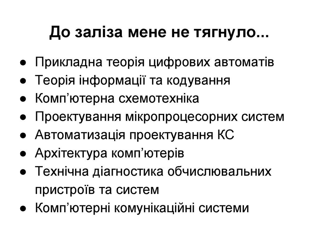• Теорія інформації та кодування • Комп’ютерна схемотехніка • Проектування мікропроцесорних систем • Автоматизація проектування КС • Архітектура комп’ютерів • Технічна діагностика обчислювальних пристроїв та систем • Комп’ютерні комунікаційні системи