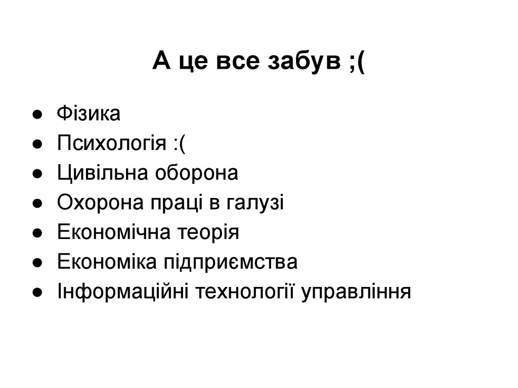 програмування • Алгоритми та методи обчислень • Структури даних та алгоритми • Організація баз даних • Дискретна математика !!! • Іноземна мова • Основи інформаційних технологій • Ресурси мережі Internet • Захист інформації в КС • Логічне та функціональне програмування !!! • Програмування (!?)