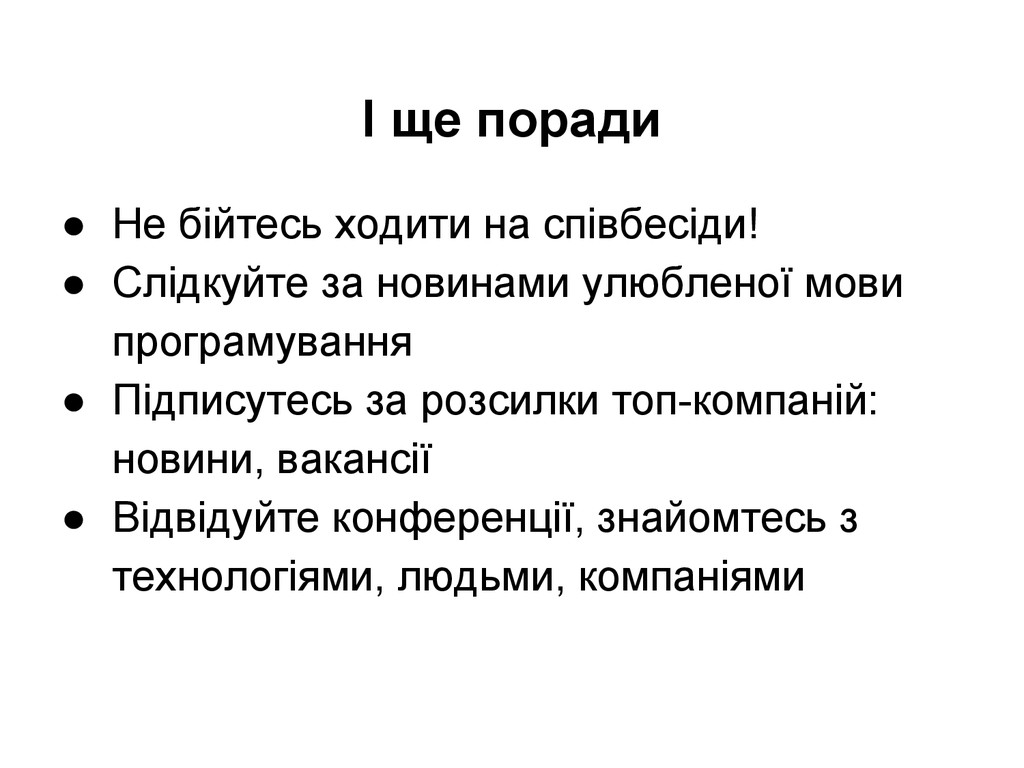 Слідкуйте за новинами улюбленої мови програмування • Підписутесь за розсилки топ-компаній: новини, вакансії • Відвідуйте конференції, знайомтесь з технологіями, людьми, компаніями