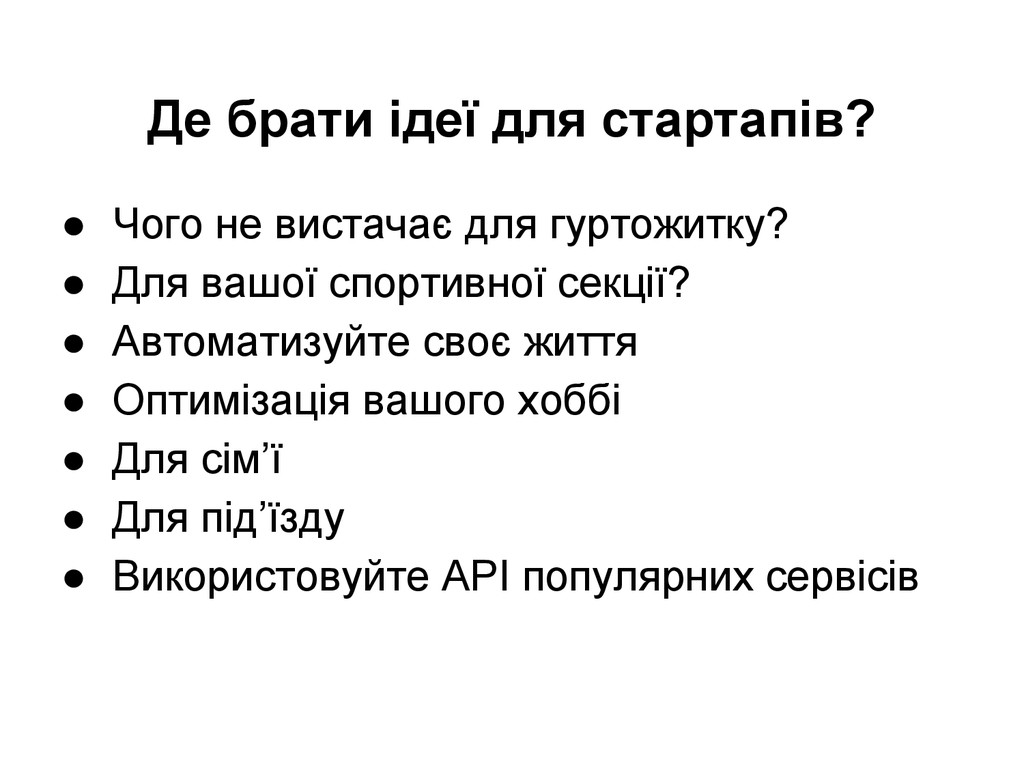 гуртожитку? • Для вашої спортивної секції? • Автоматизуйте своє життя • Оптимізація вашого хоббі • Для сім’ї • Для під’їзду • Використовуйте API популярних сервісів