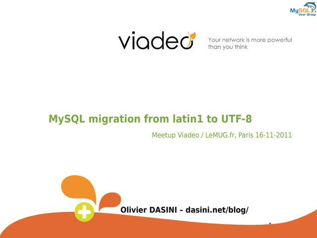 Viadeo constraints Workload: a huge amount of data is managed (Nov. 2011) • 1 000 000 new members / month • 250 000 connections / day • 165 000 active discussiondans forum • 80 000 forum member / month • 18 000 articles shared / day • 1 250 events organized / week Minimize the downtime • No connection = no income Nasty surprise • Dirty data • Legacy... MySQL constraints Maximum size of the index Characteristics related to the CHARSET & COLLATION => had suddenly became issues when migrating ...