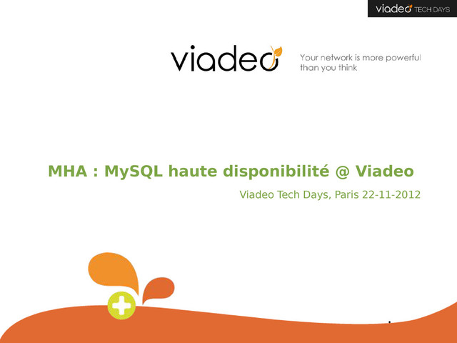 Scripts PERL MySQL 5.0+ Indépendant du moteur de stockage Ne nécessite pas de changement d'architecture Pas de coûts supplémentaires (ou presque) Le manager à une faible empreinte Installé sur une machine virtuelle à Viadeo Performant Jusqu'à présent, la bascule n'a jamais dépassée 2 secondes Compatible avec la réplication asynchrone