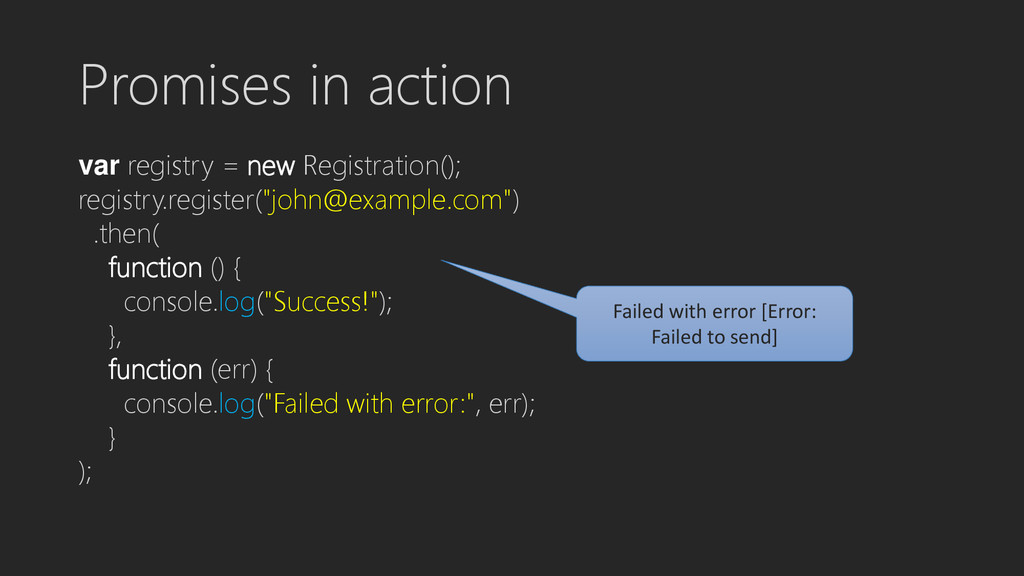 which allows us to register, send and save users. All functions are just dummies to show how error handling works. We use it with the following code: var registry = new Registration(); registry.register("[email protected]", function (err) { console.log("done", err); }); • The output tells us that the built-in error occurred and was printed successfully. Now let’s do the same with promises… done [Error: Failed to send]