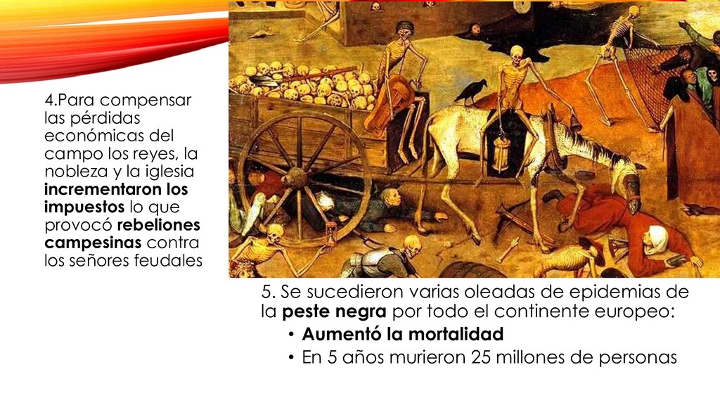 nobleza y la iglesia incrementaron los impuestos lo que provocó rebeliones campesinas contra los señores feudales 5. Se sucedieron varias oleadas de epidemias de la peste negra por todo el continente europeo: • Aumentó la mortalidad • En 5 años murieron 25 millones de personas