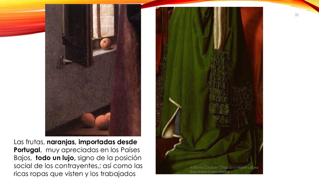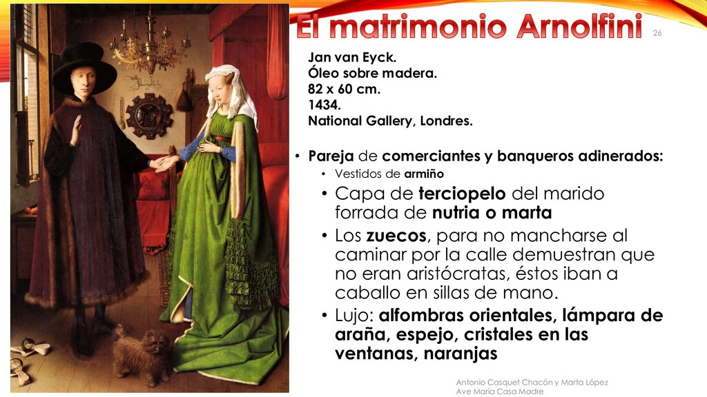 1434. National Gallery, Londres. Antonio Casquet Chacón y Marta López Ave María Casa Madre 26 • Pareja de comerciantes y banqueros adinerados: • Vestidos de armiño • Capa de terciopelo del marido forrada de nutria o marta • Los zuecos, para no mancharse al caminar por la calle demuestran que no eran aristócratas, éstos iban a caballo en sillas de mano. • Lujo: alfombras orientales, lámpara de araña, espejo, cristales en las ventanas, naranjas