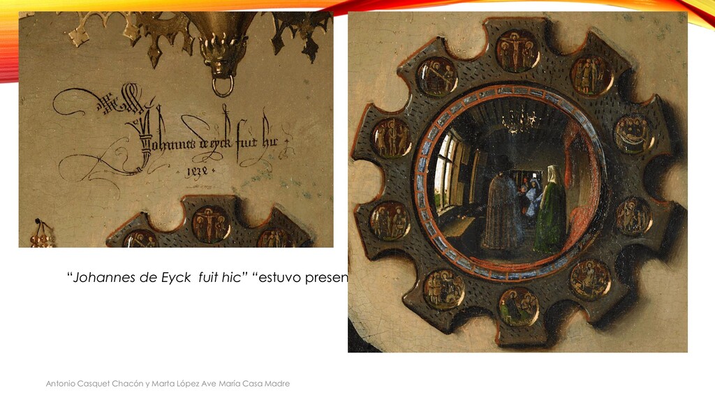 ventana, simboliza la presencia de Cristo en la unión matrimonial, por ello , sólo se enciende una vela. Espejo: objeto sagrado, espejo sin mancha, signo de pureza como las cuentas de cristal del rosario de la Santa Margarita sobre el dragón, patrona de las parturientas y de los nacimientos. Firma y presencia de Jan van Eyck como testigo del matrimonio. Antonio Casquet Chacón y Marta López Ave María Casa Madre 28