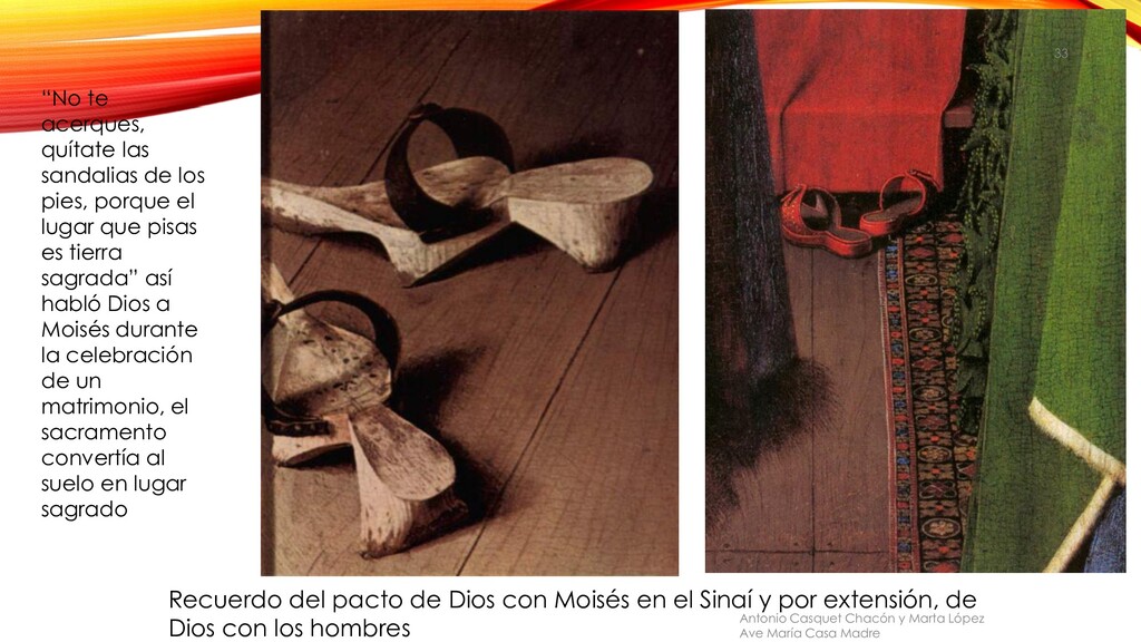 y por extensión, de Dios con los hombres Antonio Casquet Chacón y Marta López Ave María Casa Madre 33 “No te acerques, quítate las sandalias de los pies, porque el lugar que pisas es tierra sagrada” así habló Dios a Moisés durante la celebración de un matrimonio, el sacramento convertía al suelo en lugar sagrado