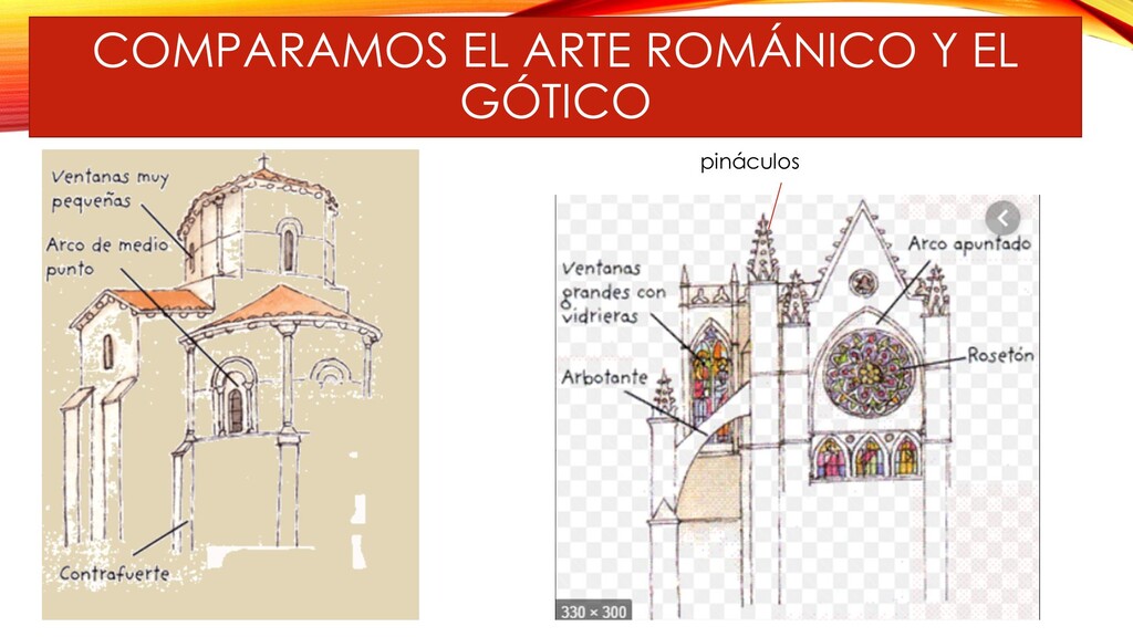 apuntado 2. Pináculos 3. Bóvedas de crucería 4. Edificios más altos reforzados con contrafuertes y arbotantes 5. Numerosas ventanas con vidrieras de colores 6. Rosetón central 7. El edificio más representativo fue la catedral: ejemplos la catedral de León, Burgos, Notre Dame de París,