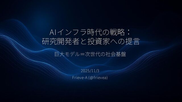 AIインフラ時代の戦略: 研究開発者と投資家への提言 巨大モデル=次世代の社会基盤 2025/11/3 Frieve-A (@frievea)