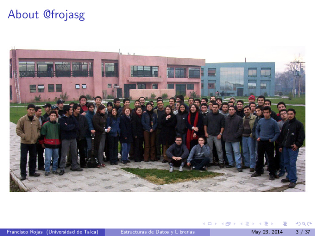 usando sus indices • El tama˜ no M´ aximo es mencionado en el problema • Dimensiones de 1-D, 2-D, 3-D y rar´ a vez se usa 4-D • Operaciones comunes: • Acceso • Ordernar • B´ usqueda Francisco Rojas (Universidad de Talca) Estructuras de Datos y Librerias May 23, 2014 13 / 37