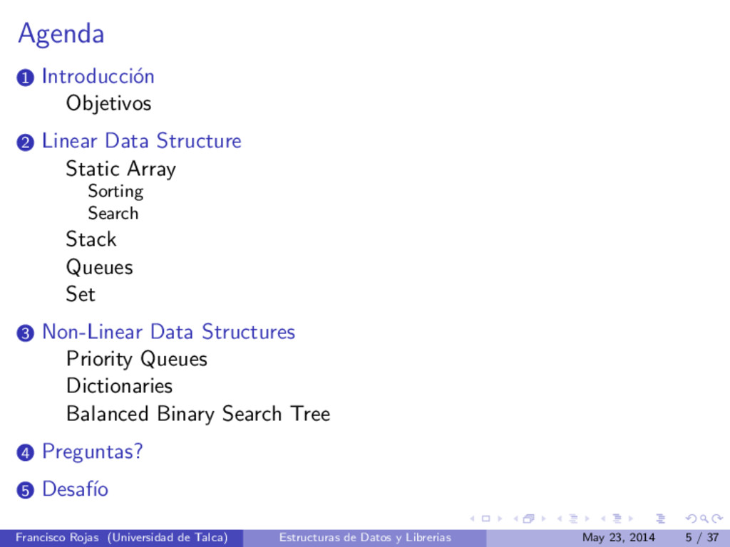 Array Sorting Search Stack Queues Set 3 Non-Linear Data Structures Priority Queues Dictionaries Balanced Binary Search Tree 4 Preguntas? 5 Desaf´ ıo Francisco Rojas (Universidad de Talca) Estructuras de Datos y Librerias May 23, 2014 5 / 37