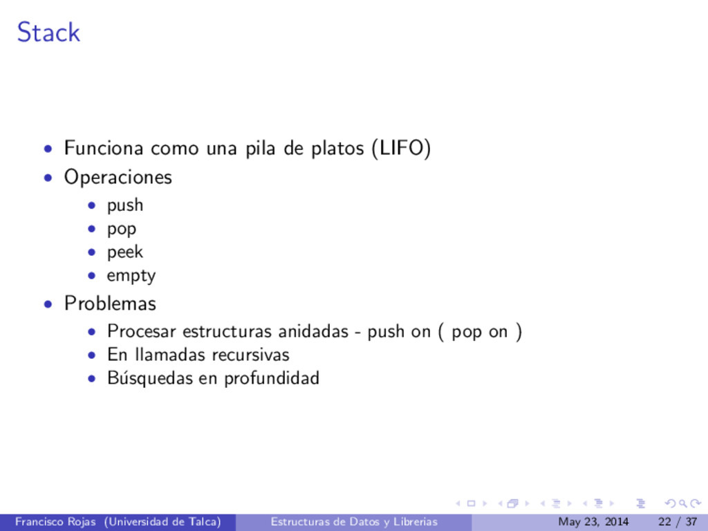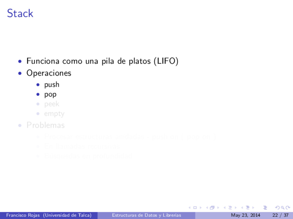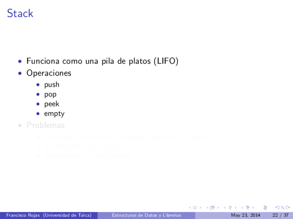 Operaciones • push • pop • peek • empty • Problemas • Procesar estructuras anidadas - push on ( pop on ) • En llamadas recursivas • B´ usquedas en profundidad Francisco Rojas (Universidad de Talca) Estructuras de Datos y Librerias May 23, 2014 22 / 37