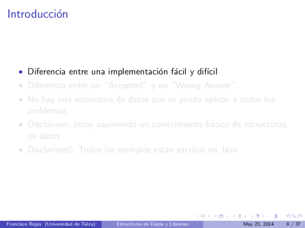 y dif´ ıcil • Diferencia entre un “Accepted” y un “Wrong Answer” • No hay una estructura de datos que se pueda aplicar a todos los problemas • Disclaimer: estoy asumiendo un conocimiento b´ asico de estructuras de datos • Disclaimer2: Todos los ejemplos estan escritos en Java Francisco Rojas (Universidad de Talca) Estructuras de Datos y Librerias May 23, 2014 8 / 37