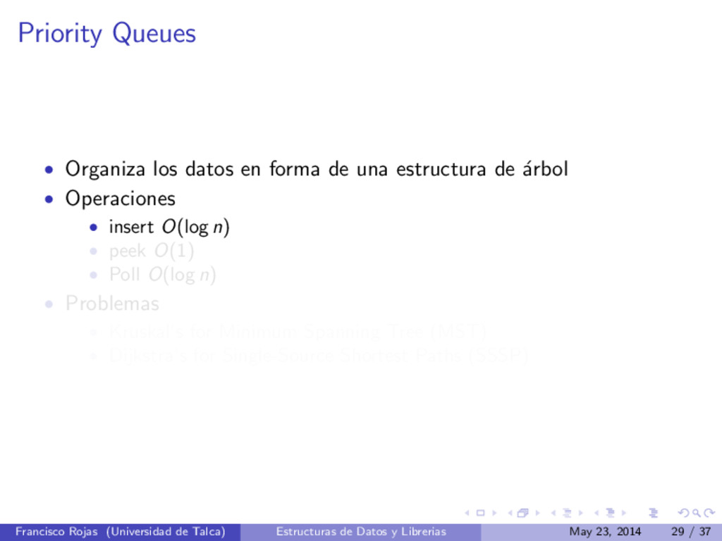 estructura de ´ arbol • Operaciones • insert O(log n) • peek O(1) • Poll O(log n) • Problemas • Kruskal’s for Minimum Spanning Tree (MST) • Dijkstra’s for Single-Source Shortest Paths (SSSP) Francisco Rojas (Universidad de Talca) Estructuras de Datos y Librerias May 23, 2014 29 / 37