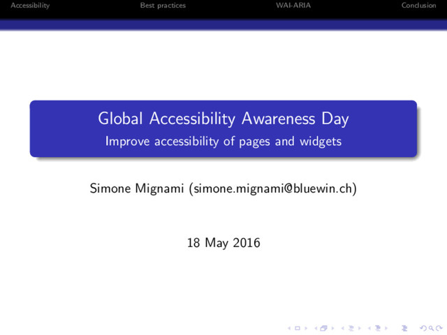 focus can be painful, be careful! Usually navigation order is infered from DOM Synchronize focus and visual navigation with CSS (you may use different classes and switch them with Javascript) Emulate normal GUI navigation on your widgets Support Power User approach Auto-focus Be careful when setting the page focus: screen readers may read just the element and not the page!