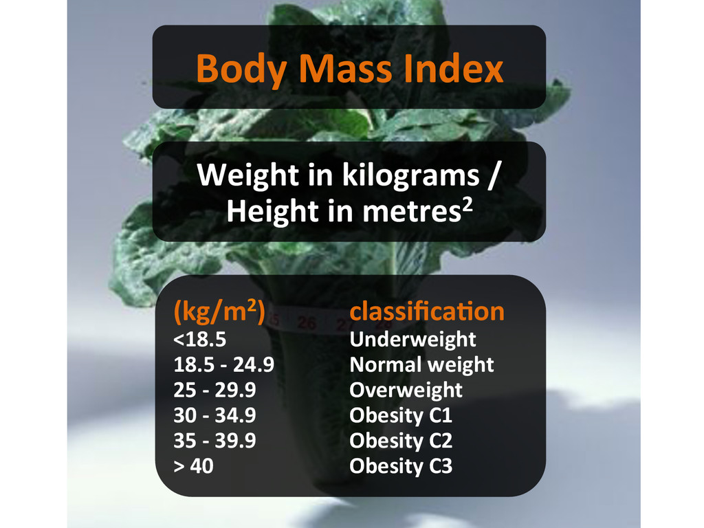 18.5)[)24.9) ) )Normal)weight) 25)[)29.9 ) ) )Overweight) 30)[)34.9 ) ) )Obesity)C1) 35)[)39.9 ) ) )Obesity)C2) >)40 ) ) ) )Obesity)C3) Body)Mass)Index) Weight)in)kilograms)/)) Height)in)metres2))