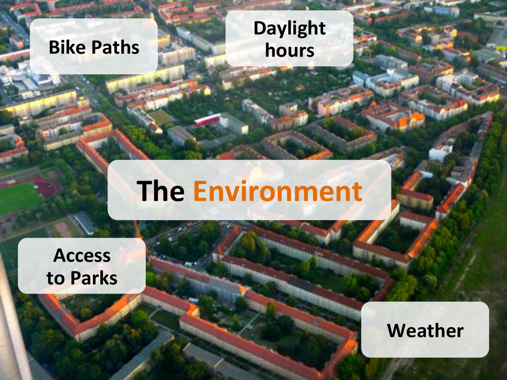 The)Environment) Bike)Paths) Access) to)Parks) Weather) LocaBon) Daylight) hours)